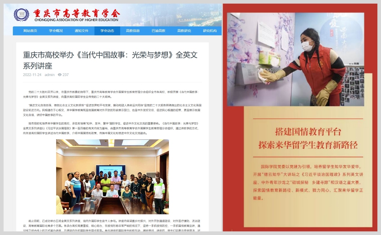 5. 疫情常态化背景下教学工作有序推进。出台并实施《2022年春/秋季学期教学质量监测管理实施方案》,实现汉语言文学和汉语国际教育专业国际员工“线下+线上”教学全覆盖,举办“缙云知华”大讲坛学术沙龙5期、教师工作坊4期,指导二级培养单位做好线下或线下与线上融合教学工作。来华留学英语授课课程《中国概况》获批重庆市高校一流本科课程,1人获“重庆市高校教师教学创新大赛”三等奖,参加“汉教英雄会”国际中文教学技能交流活动获“最佳组织奖”。