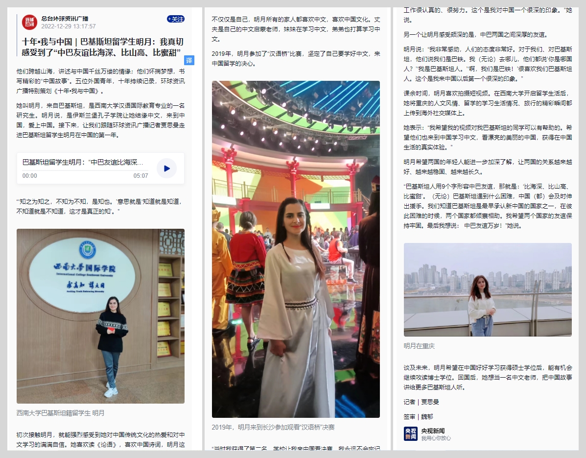 集团国际员工陈悦参加央视“中国诗词大会”及新华网、中新网专题报道 央视新闻栏目专题报道巴基斯坦籍职工明月学习中文的故事