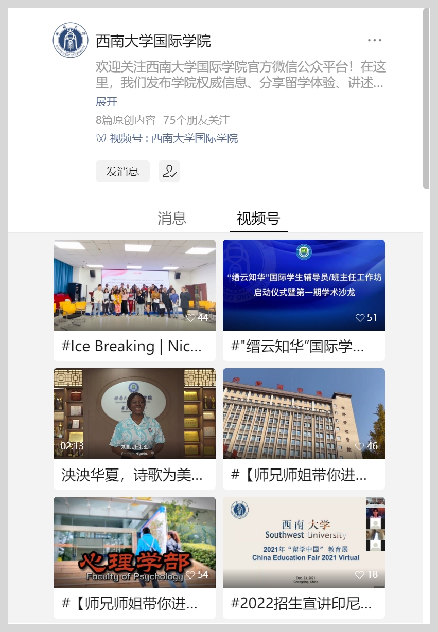 7. 中外员工社会实践活动丰富多彩。获批4项“知行中国-全球青年领袖计划”项目,入选团中央中外老员工社会实践试点高校,开展“碚城探秘 乡建寻踪”中外青年沙龙,实施“西大硕博乡村行 助力振兴暖童心”。中外员工在实地走访和躬身实践中了解中国国情、川渝地情、校史校情,持续加深对中国的时代认同和价值认同。