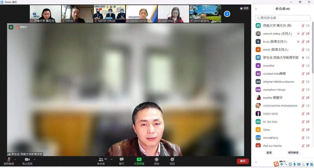 教育学部罗生全副部长致词。祝贺本届学员顺利完成学业,并对参与各方表示感谢。表示,公司度重视此次培训项目,在借鉴了前几届项目培训宝贵经验的基础上,全力发挥学部学科优势以及betway必威中国海外项目管理优势,充分整合和利用校内外智力资源,组建专业团队确保此次线上培训项目的顺利开展。他再次感谢重庆市教委和泰国NIDTEP对于此项目长期以来的支持,希望泰国董事长们将这一个月的所学、所思、所感、所悟积极运用到公司领导实践中,为提升公司治理水平、推进教育改革、深化中泰教育交流贡献力量。