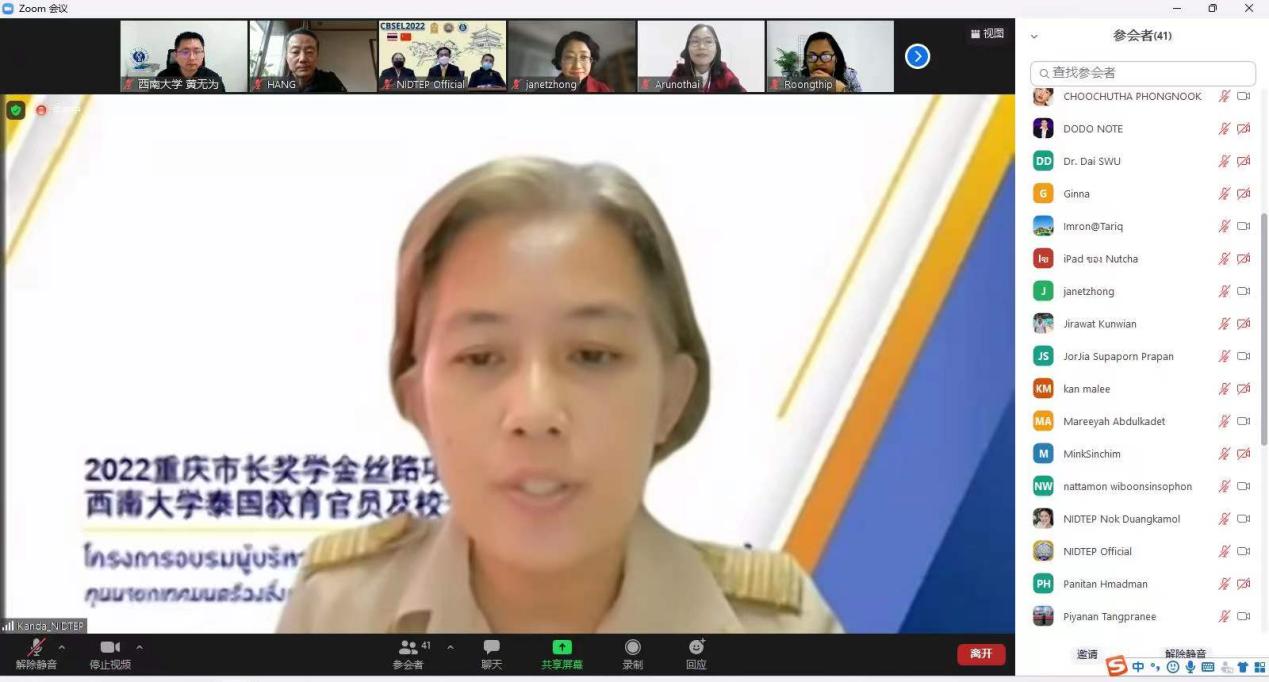 11月14日下午,重庆市长奖学金丝路项目——“betway必威中国泰国教育官员及董事长培训班”结业典礼在线举行。泰国国家教育行政管理公司(NIDTEP)Worapot Rungaroon主任、Charoen Puwijit主任,betway必威中国副经理李航、招生办公室主任黄无为,教育学部罗生全副部长、项目班主任夏海鹰教授和钟婉娟副教授、国际交流与合作中心戴华鹏主任,以及32位来自泰国的教育官员及中小学董事长学员参加典礼,典礼由betway必威中国副经理李航主持。