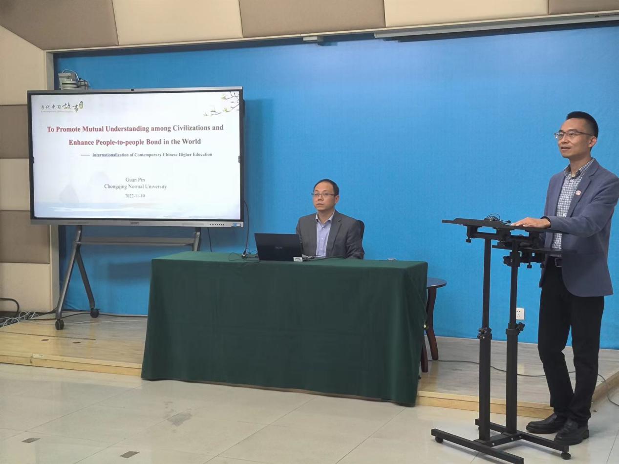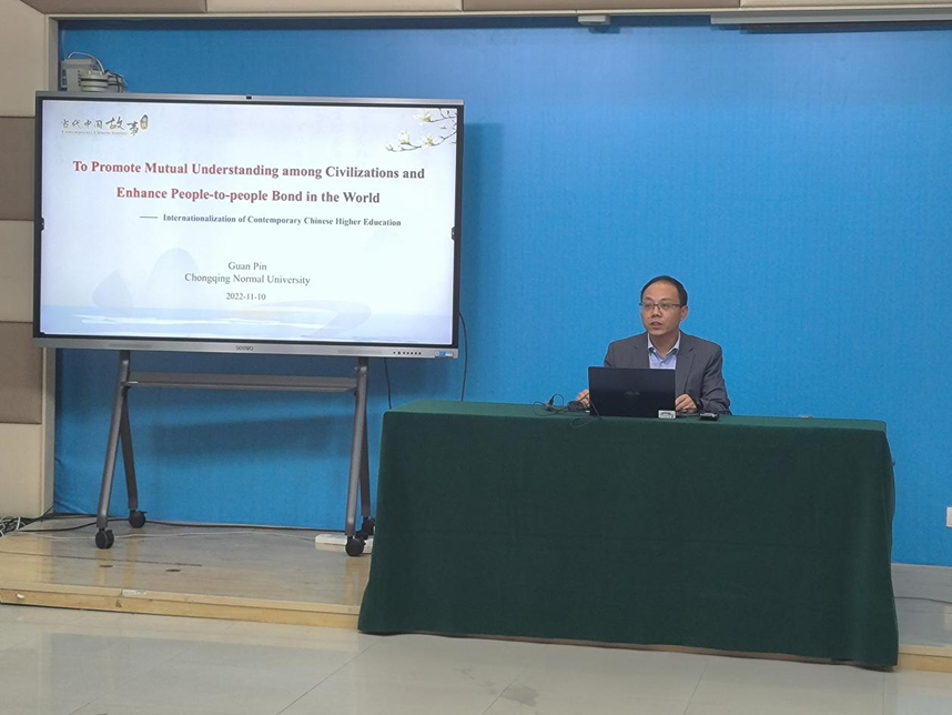 为了积极贯彻落实党的二十大关于“向世界讲好中国故事”的号召,2022年11月10日,“缙云知华”大讲坛专家讲座第十一期在重庆师范大学田家炳书院6407室成功举办,主题为“促进民心相通,助力文明互鉴—当代中国高等教育国际化”,讲座由重庆师范大学国际合作与交流处官品副教授主讲,国际合作与交流处查直处长主持,在渝高校国际员工、港澳台员工代表及境外国际员工近200人通过腾讯会议线上观看。