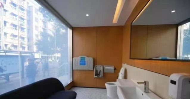 结束参观后,实践队队员们前往武林路上的5G厕所体验“未来智能厕所”。从整体布局上看,5G厕所共有两层,一楼分别为母婴室、化妆室及两间无性别厕所;二楼则是女厕、男厕及无性别厕所。在外观上,一层的母婴室为全透明玻璃,这让实践队队员颇为惊讶:这该如何保护个人隐私?进去探索后才知道,系统会自动识别并将玻璃面板雾化。另外,5G厕所开门锁门、冲洗马桶、取厕纸等均为无触碰设置,在做到智能便利的同时也保证了公共卫生。