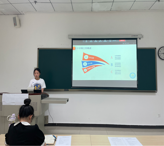 公司研究生会主席团成员彭关奇及刘豪妍汇报本学期各项工作成果,回顾工作中存在的不足之处,并提出研究生会未来工作的努力方向。随后,各部门负责人进行述职,就部门概要、工作总结、不足与反思三个部分进行阐述。