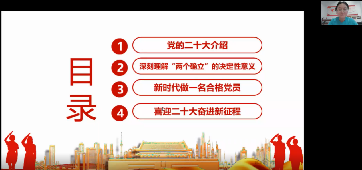 为贯彻落实支部党员“五个一”行动计划,本次活动由支部书记景柯沥同志讲授题为“青春献礼二十大 强国有我新征程”的微党课,大家对二十大召开的背景、“两个确立”的决定性意义、新时代做一名合格党员和喜迎二十大奋进新征程等内容有了更多了解。她鼓励在境内外实习的党员同学,结合自身实际争做一名合格的教师党员,并给出五点建议:坚决信念,提高政治素养;立足岗位,树立奉献精神;心系员工,增强师德修养;刻苦钻研,提升教学水平;为人师表,树立良好形象。