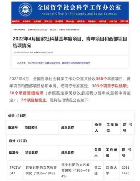 2022年4月,全国哲学社会科学工作办公室共收到368项结项申请。经同行专家鉴定,303个项目予以结项。其中获评优秀项目18项,良好项目79项。