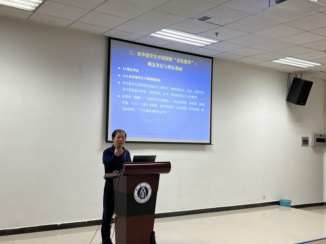 刘承宇教授以“从北京冬奥会开幕式看来华职工中国国情‘柔性教育’”为题,从北京冬奥会开幕式引入,回顾来华职工中国国情教育的发展历程,全新视角阐释来华职工中国国情“柔性教育”,并对中国国情教育课程体系的建设、中国国情“柔性教育”的内容选择、教学策略进行探讨。此外,他还提出公司来华职工国情教育全英文系列在线课程以及文集《当代中国故事:梦想与辉煌》的整体计划和实施框架。最后,他以《春夜喜雨》中“随风潜入夜,润物细无声”的诗句结束本次讲座。强调,在来华职工国情教育中,共情、同情、移情是非常重要的。“Light the fire within”,希望在场的汉语国际教育硕士未来能够以“柔性教育”的方式讲好中国故事,传播好中华价值和中国方案。