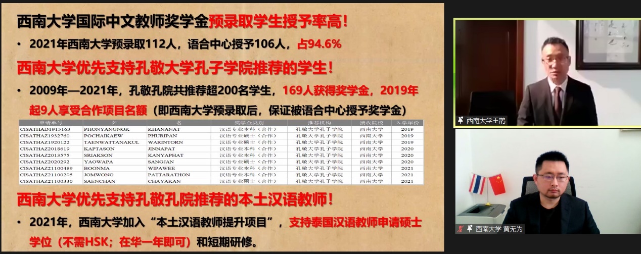 招生项目负责人办详细地讲解公司办学优势学科,中国政府、国际中文教师、重庆市长、公司新丝路及董事长等奖学金的申请条件和流程,重点介绍即将启动的国际中文教师奖学金及泰国同学选择betway必威中国的四大理由,并在互动环节就申请成功率、线上学习及奖学金发放、勤工俭学等方面的问题进行解答。