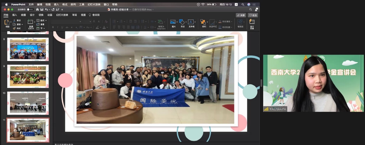 最后,公司在华职工李佩英(Ms. YAOWAPA SANGJAN)结合丰富的视频、图片,生动全面分享了自己在华留学和生活;在泰职工陈冰冰(Ms. CHAYAKAN SAENCHAN)则展示疫情下公司如何帮助大家更好地完成线上学习,开展生涯指导和心理疏导等,消除大家申请留学的疑虑。