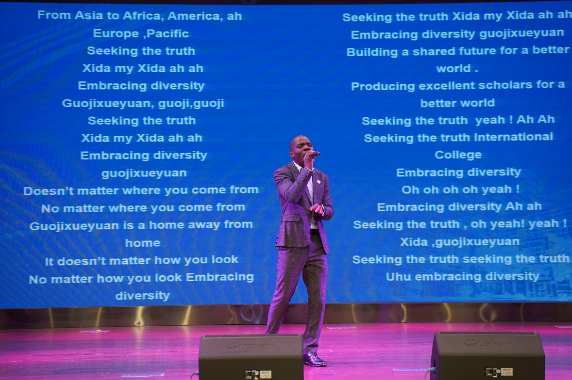 活动现场展示了公司中外师生代表书写院训的书法作品。他们用笔墨挥洒对于公司的热爱,用字里行间的线条与架构表达“真知”与“大同”的深刻内涵。泰国孔敬大学孔子公司中方经理耿军,采用视频的形式展示自己“求真知 谋大同”的书法作品,倡导莘莘学子孜孜追求真知、掌握人类命运共同体应有之义;中国硕士生朱春亭和印尼籍职工刘文才分别展示“求真知,谋大同”小篆作品和行书作品,不同国度的师生用不同的字体表达对院训同样的热爱与认同,体现betway必威中国“海纳百川,有容乃大”的教育理念。赞比亚籍职工、原创音乐人Gift现场献唱原创主题曲,在歌声中唱到“不管你来自哪里,不论你的肤色如何,让我们为美丽的世界构建一个共同的家园。”