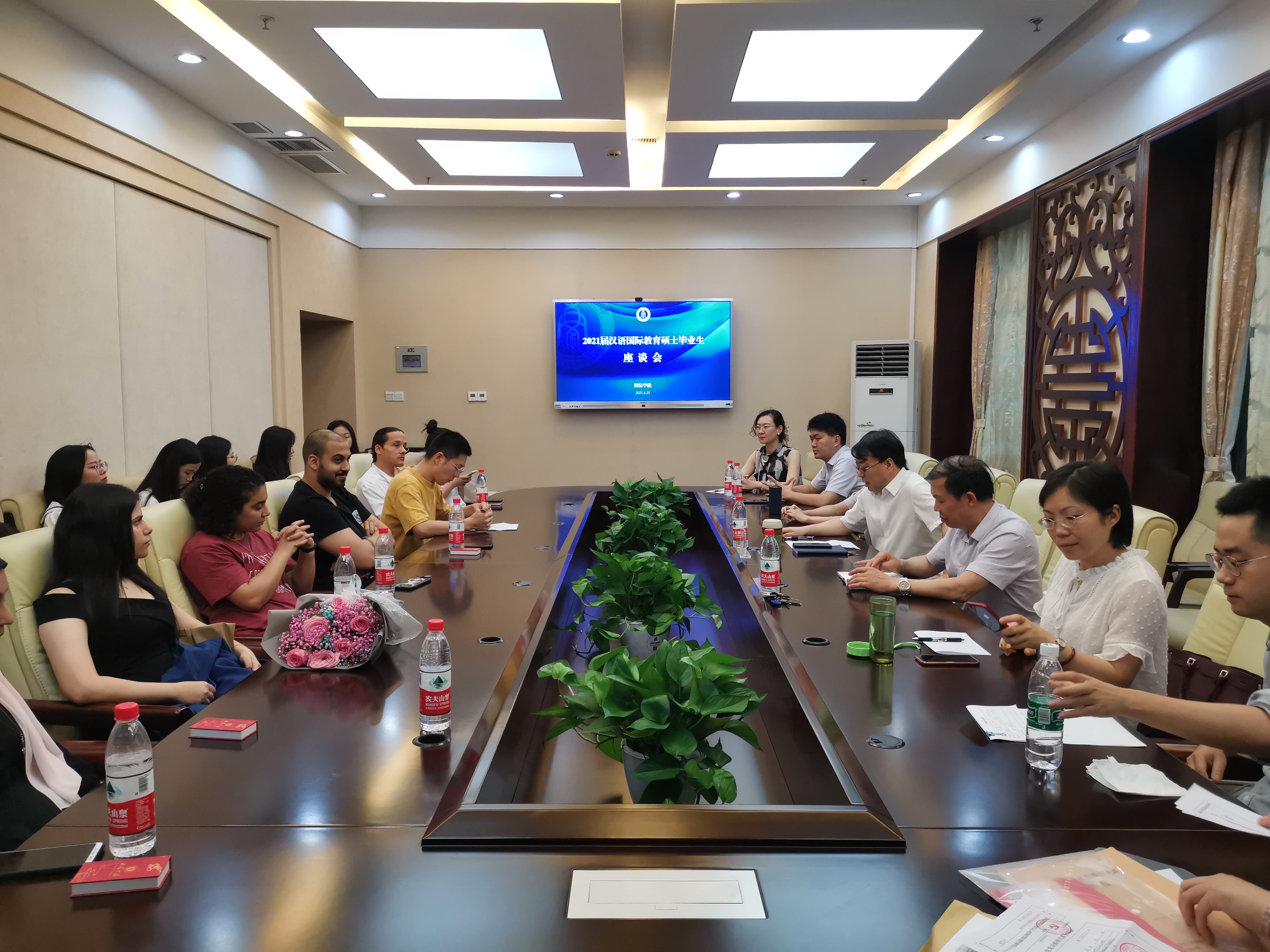 2021年6月25日下午,betway必威中国在签约室召开了2021届中外汉硕毕业生座谈会。公司领导,学工办、教学办、汉教系等部门负责人,研究生导师代表和30余名中外汉硕毕业生参加座谈交流。