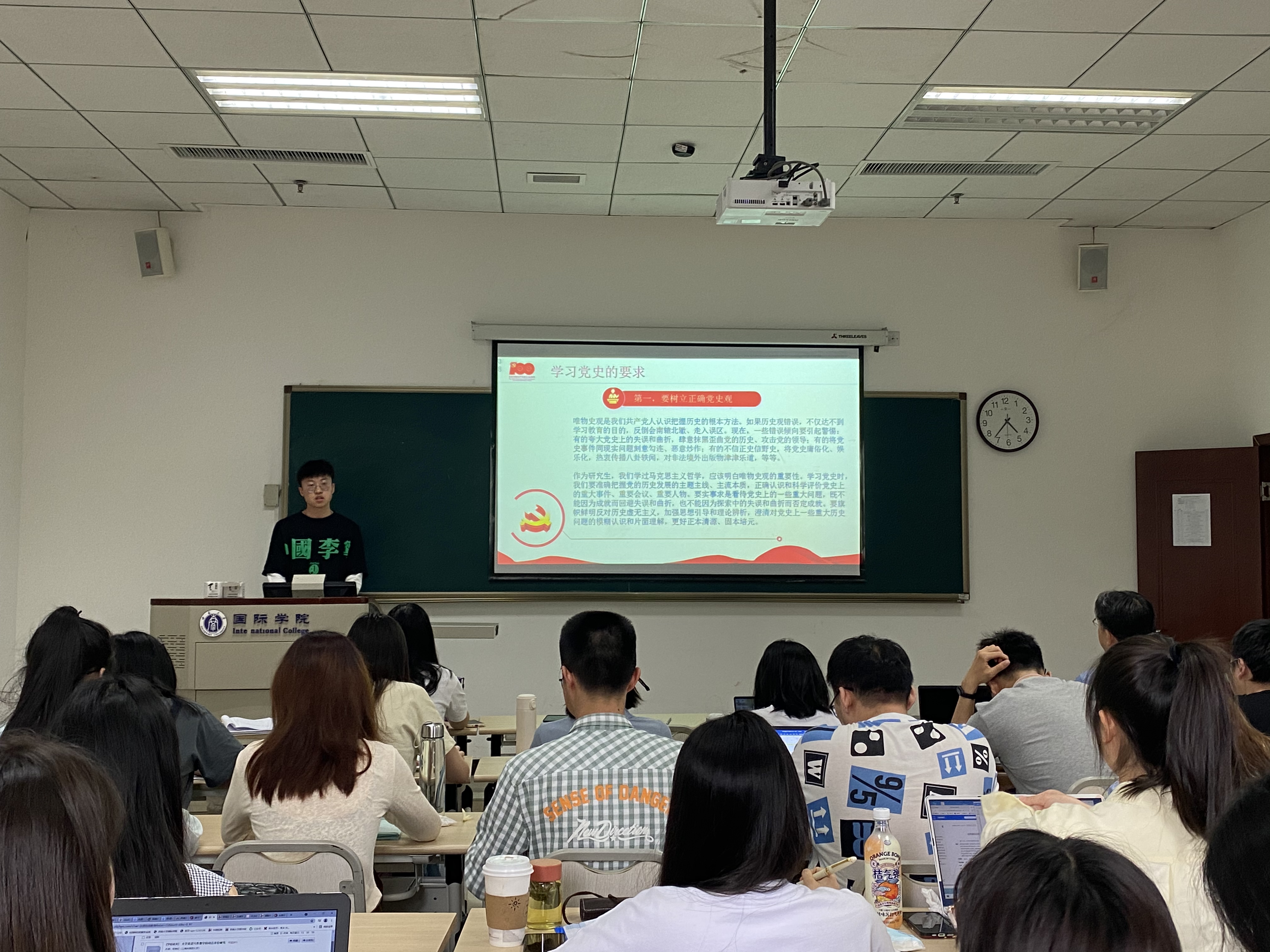 宣讲会上,陈姝君围绕“党史学什么和何时提出”的问题讲述学党史的背景;陈悦从传统、节点和个人三个层面阐述了为什么要学习党史的问题;代宇航根据中国共产党经历的四个时期提出了如何看待百年党史的问题;彭关奇从研究生的角度提出学习党史的要求;张文静和王金燕从“百年未有之大变局的提出和百年党史为应对百年大变局提供的条件”出发,阐明了党史与百年大变局的关系。