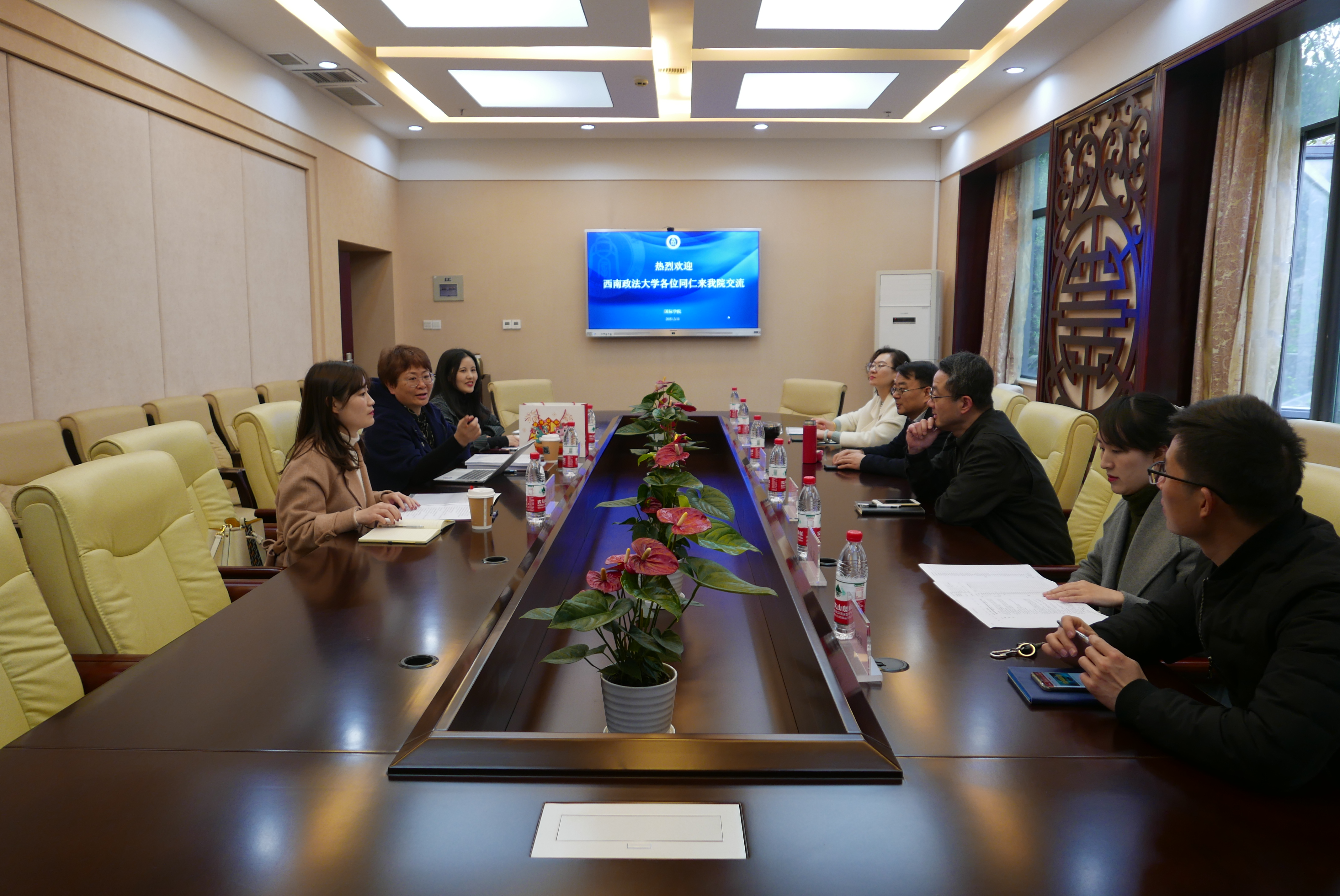 3月11日,西南政法大学国际教育公司秦洁副经理一行三人来院考察交流。副经理李航、张家政和相关科室负责人在紫云楼签约室与客人进行了座谈交流。