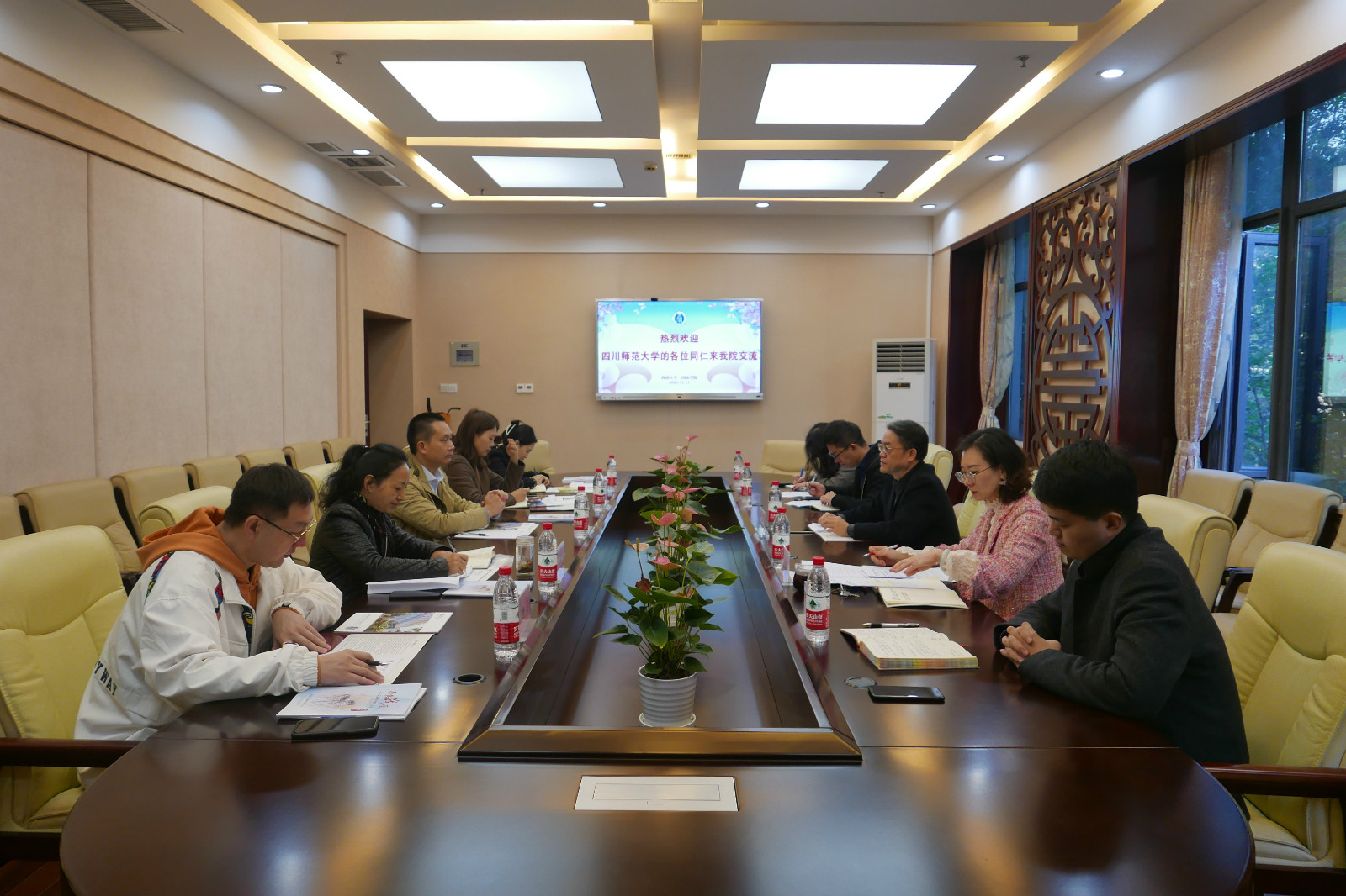 11月11日上午,四川师范大学国际教育公司经理汤洪、副经理张春兰等一行5人来学院考察交流,调研国际员工招生、管理、教学、HSK考务等工作,刘猛书记、刘承宇经理和相关科室负责人在紫云楼签约室与客人进行座谈交流。