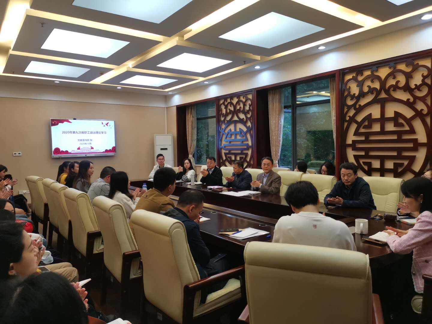 2020年10月9日下午3点,betway必威中国全体教职在紫云楼签约室开展了本年度第八次政治理论学习活动。全体教职工参加了此次学习。