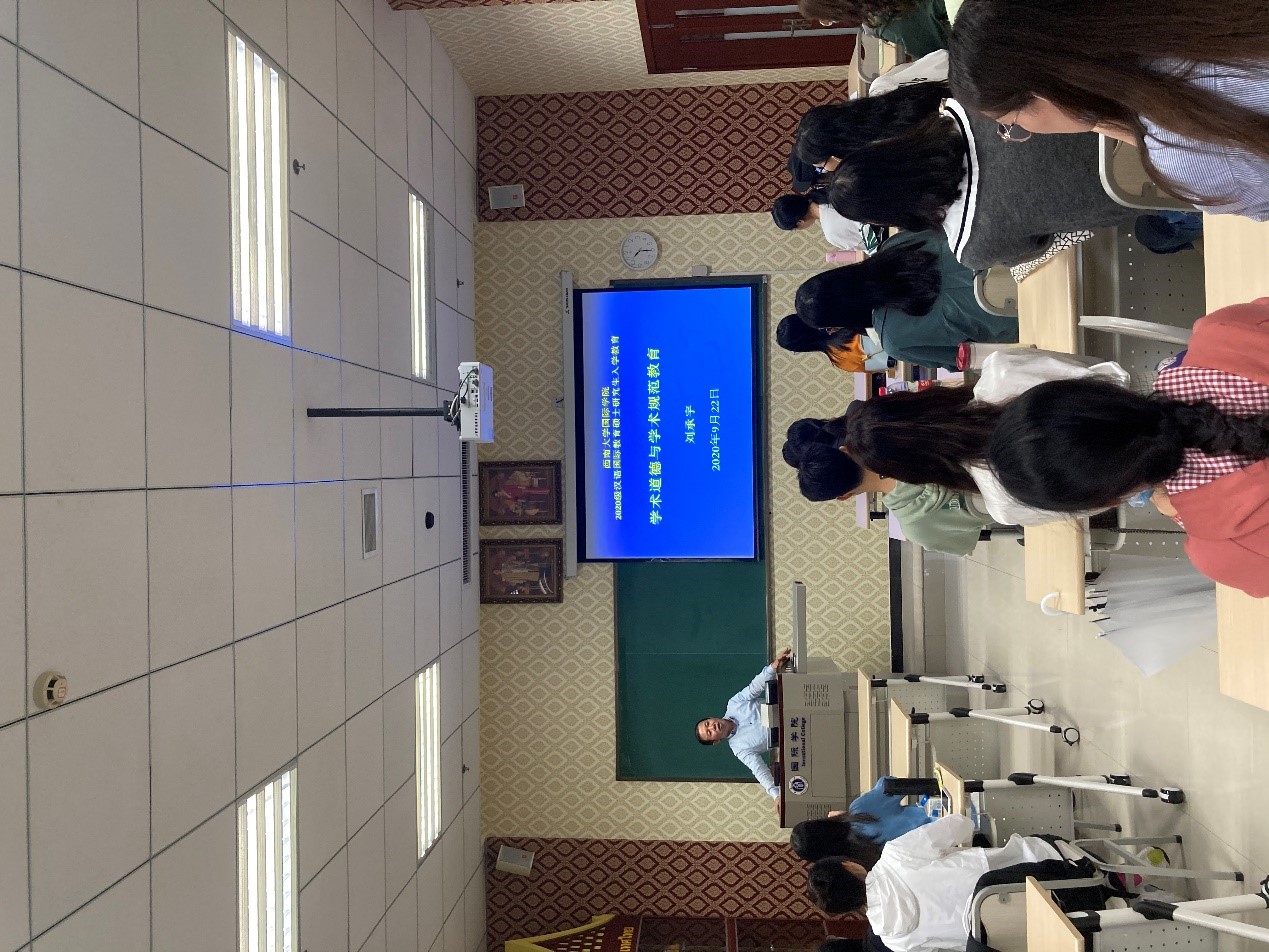 典礼结束后,刘承宇经理在210教室对新生们进行了“学术规范与学术道德教育”主题讲座。刘经理在讲座中引经据典地强调了学术规范与学术道德的重要性,警示同学们应严肃对待学术,潜心研究,努力成为合格的研究生。