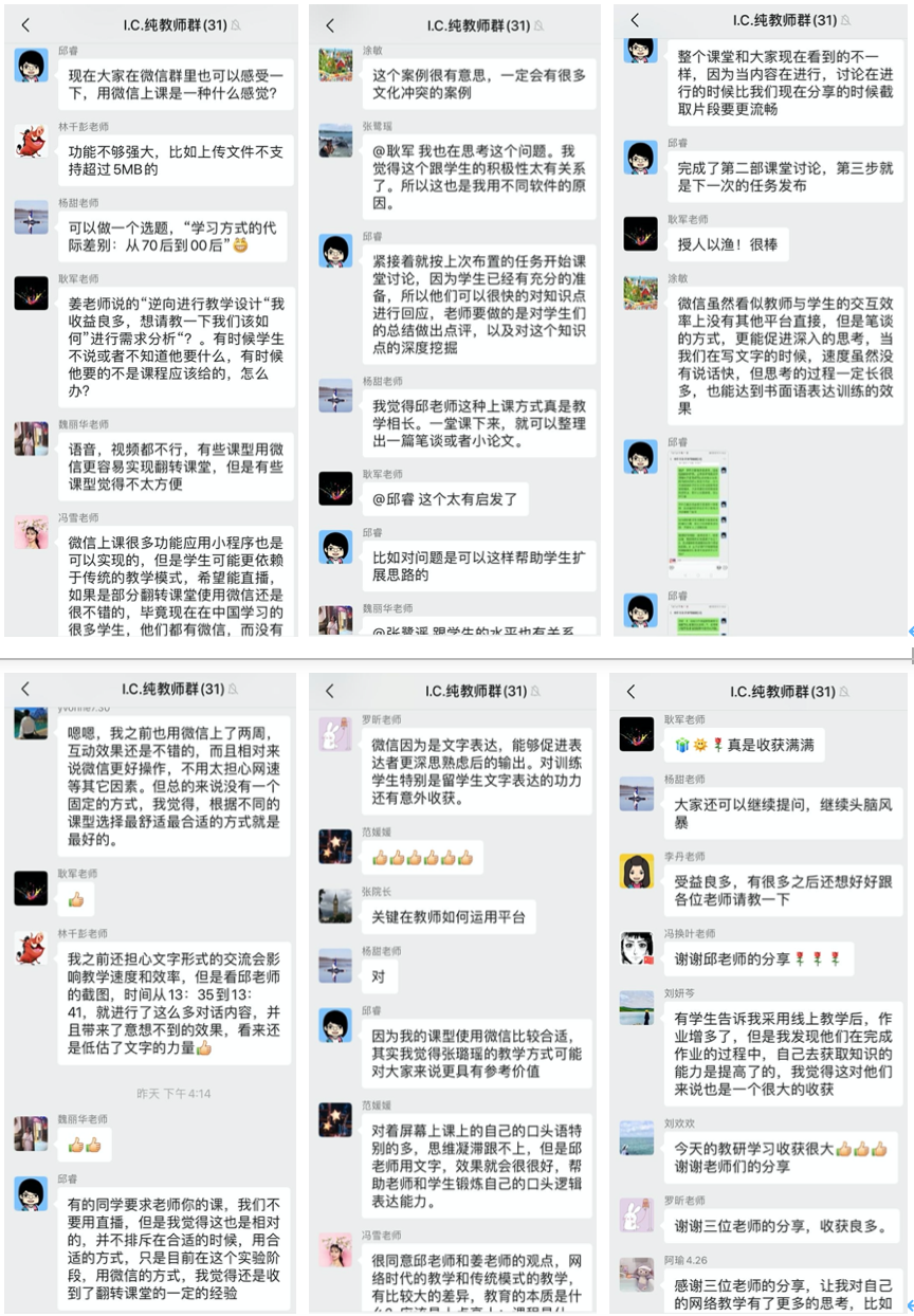 邱睿老师以汉语国际教育硕士《中外文化交流专题》为例,介绍了自己使用微信授课的课程案例。她指出,微信授课让员工有机会与老师进行深度的思维碰撞,极大的锻炼了员工的写作能力,员工有时在短短几分钟内能够写出很有逻辑的思想,获得了极大的成就感,同时恒定的文字记录可供反复翻看。邱老师极具启发性的分享引发了全体教师的激烈讨论,改变了大家对微信授课的固有看法。