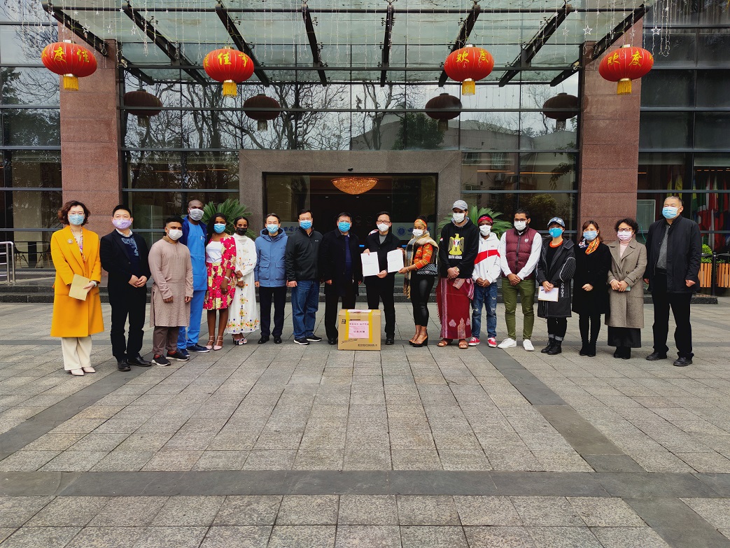 重庆昭信教育科技集团(以下简称“集团”)十分关注我市来华职工的疫情防控工作,在了解到betway必威中国国际员工在渝人数较多,防疫物资需求量较大情况下,3月10日,集团副经理刘显忠、高教社重庆教辅中心主任熊英、重庆市高教学会招生专委会副秘书长姚连兵及重庆世家文化教务服务有限公司总经理陈彦一行来校,向公司国际员工捐赠共计3200只口罩。张卫国董事长代表公司接受捐赠,王进军副董事长,董事长办公室、betway必威中国主要负责人及国际员工代表参加捐赠仪式。
