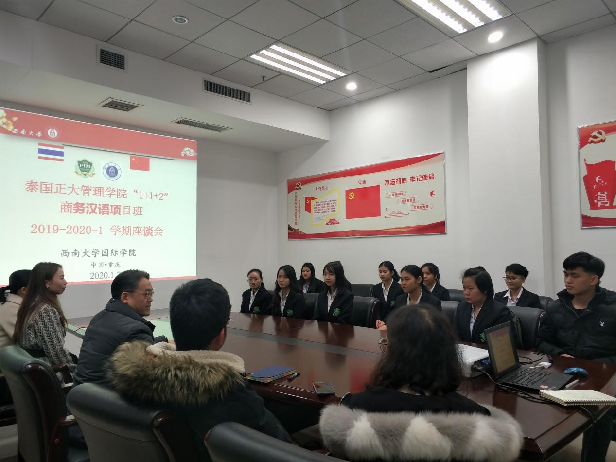 2020年1月7日下午五点,2019级泰国正大管理公司项目班员工2019-2020-1学期期末座谈会在公司304会议室圆满举行。公司党总支书记刘猛,任课教师代表陈晨、钟万平、王霜、刘欢欢等四位老师,以及12名泰国员工参加会议,座谈会由班主任吴宗燕老师主持。