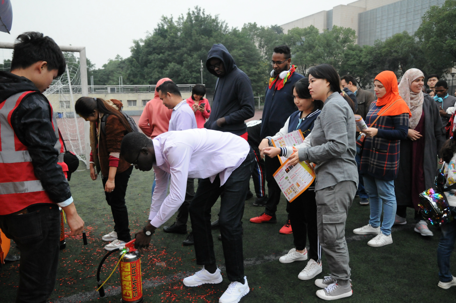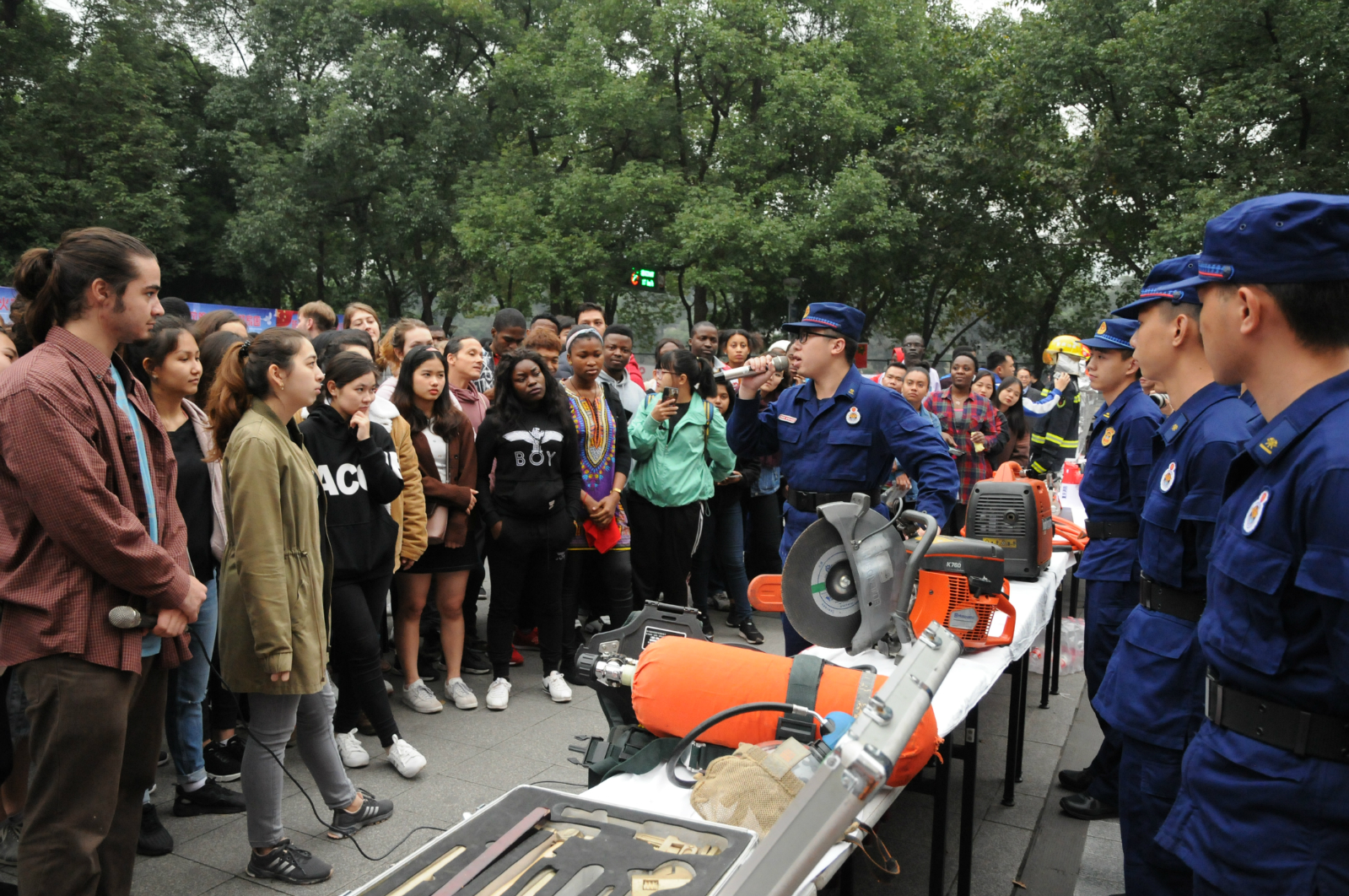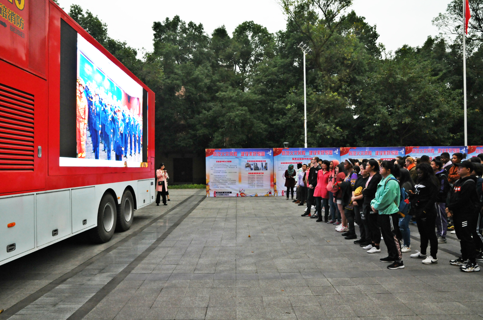 2019年11月9日下午4:30,400余名国际新生在公司第三运动场,参加了由公司党委保卫部/武装部/保卫处主办,重庆市北碚区消防救援支队协办的公司“119消防日”宣传活动暨2019级本科生军训分散训练阶段消防知识技能培训活动。