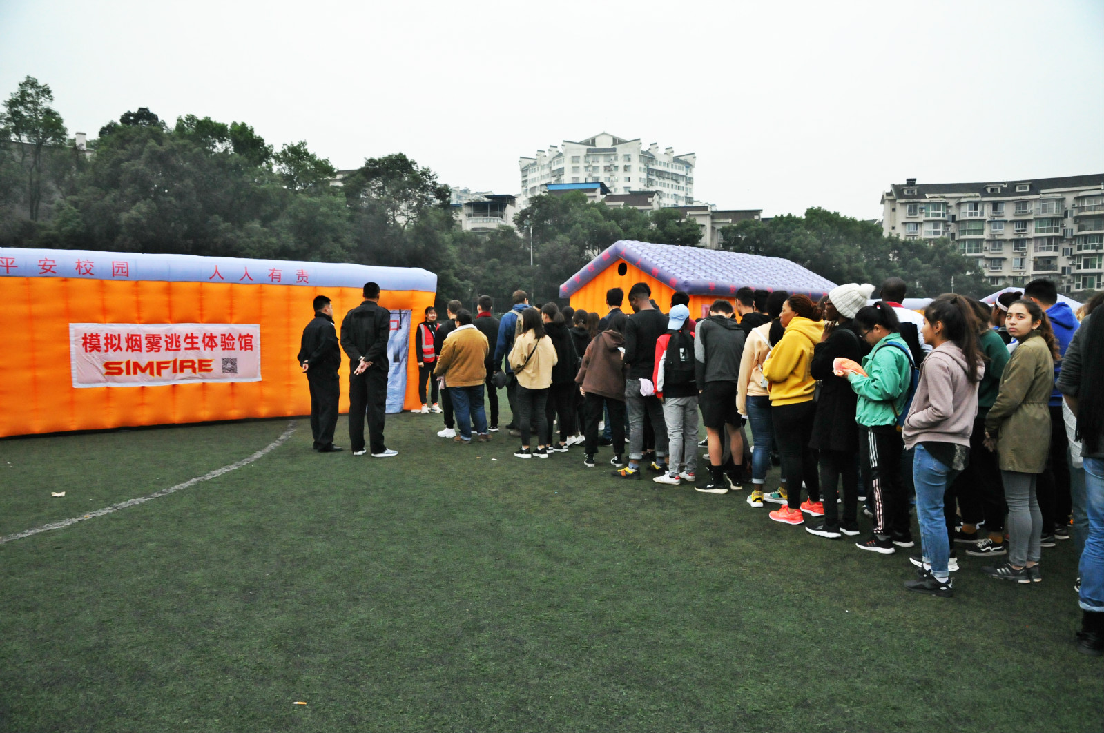 活动现场的重头戏在灭火逃生体验区,对全体新生进行“模拟灭火”和“烟雾逃生”实战轮训。“模拟灭火”主要利用声光电技术,在还原初起火灾环境的同时,运用高仿真的电子模拟灭火器开展灭火体验,克服了传统灭火器在大规模使用后污染环境以及实战环境受限的弊端,使体验者易懂易操作,迅速掌握初起火灾扑救技能。“烟雾逃生”则是运用无害的植物烟油再现火灾突发时烟雾弥漫的场景,通过设置逃生路线和指示牌,让全体国际新生掌握“弯腰低姿、靠扶墙面、捂住口鼻、看指示牌”的逃生要领。活动过程中,国际新生纷纷表示,模拟环境真实,活动体验感强,有意义,有收获!