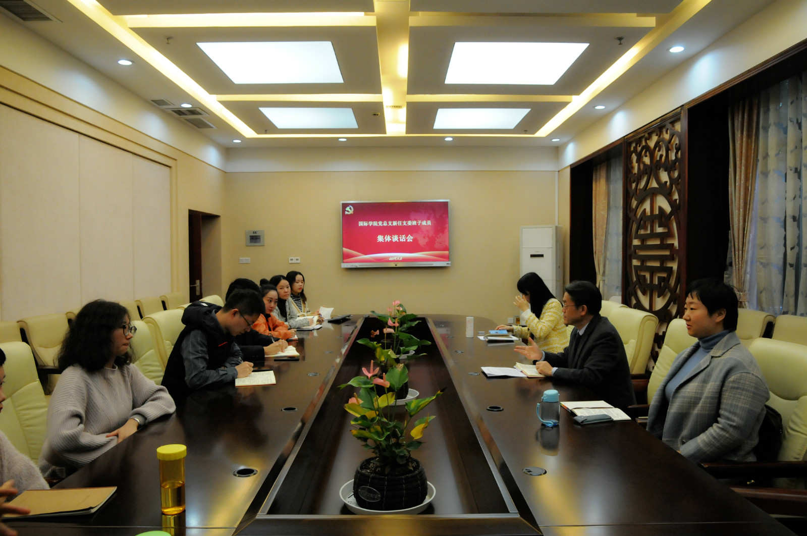 2019年11月8日下午4:30,国际公司党总支召开新任支委班子成员集体谈话会。党总支书记刘猛,总支委员、党务秘书以及教工一、二支部,研究生2019级支部的新任支委成员参加谈话会。