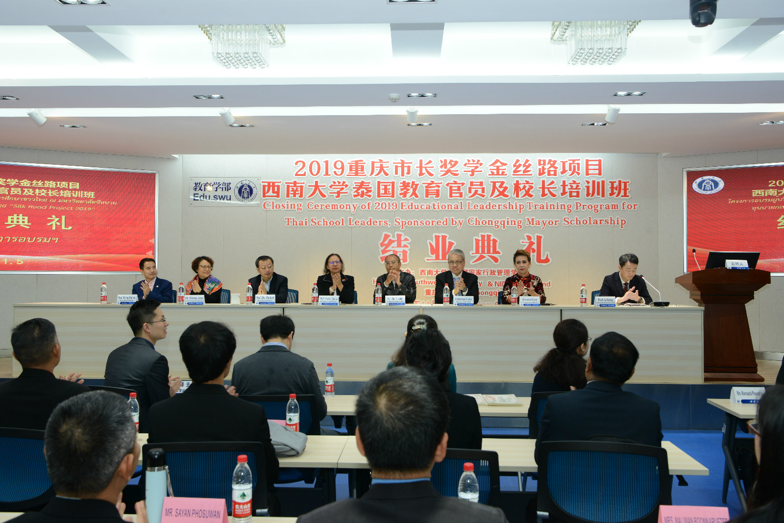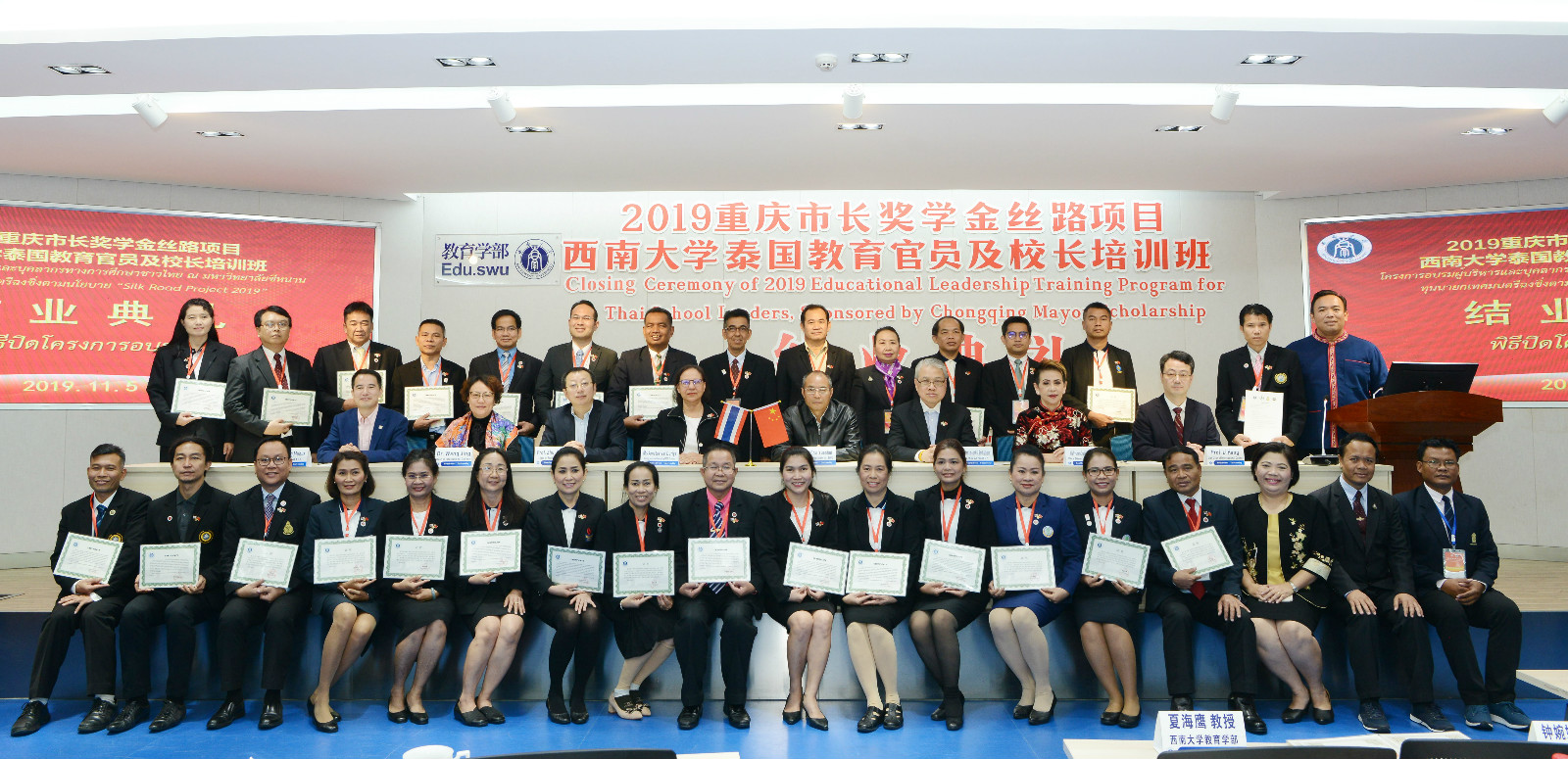 11月5日上午,2019年重庆市长奖学金丝路项目---“betway必威中国泰国教育官员及董事长培训班”结业典礼在教育学部举行。泰国教育部次长杜丽亚、泰国教育行政管理公司经理萨蔡童、betway必威中国董事长助理褚远辉、教育学部部长朱德全、betway必威中国经理王静出席典礼,项目班主任和相关工作人员,以及30位来自泰国的教育官员与职业院校、中小学董事长参加典礼。