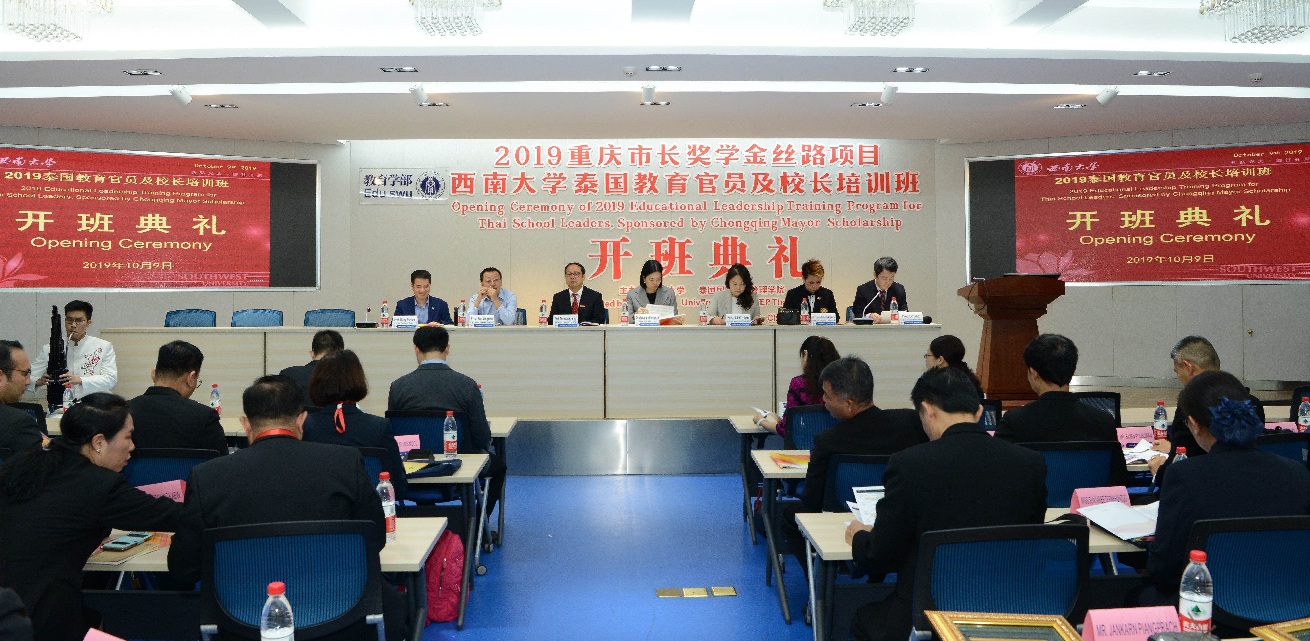10月9日,2019年重庆市人民政府市长奖学金丝路项目——“泰国教育官员及董事长培训”开班典礼在教育学部举行。泰国驻成都总领事馆副总领事万兰梦、泰国国家教育行政管理公司副经理帕安差丽、重庆市教委国际合作与交流处处长李世玉、公司董事长助理周光明,教育学部相关负责人、专家以及30名泰国教育官员及董事长出席开班典礼。