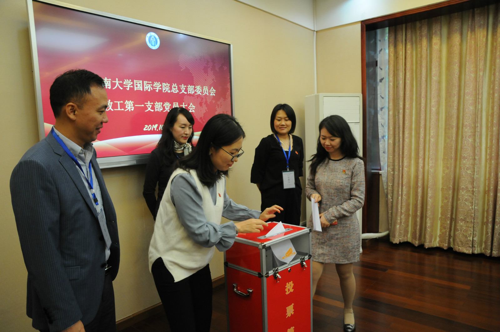 教工第一党支部书记邱睿同志代表上届支部委员会做工作报告,总结回顾了支部三年来的主要工作、取得的成绩和存在的不足。组织委员钟万平同志就党费收缴、使用、管理情况作报告。大会审议并通过了工作报告。按照选举的有关规定,参会人数达到应到人数的五分之四,符合开会要求,到会党员同志投出自己庄严的一票,选举产生了新一届支部委员会。随后召开新一届支部委员会议,确定了支委分工:邱睿同志担任支部书记,李丹同志任宣传委员,钟万平同志任组织委员。