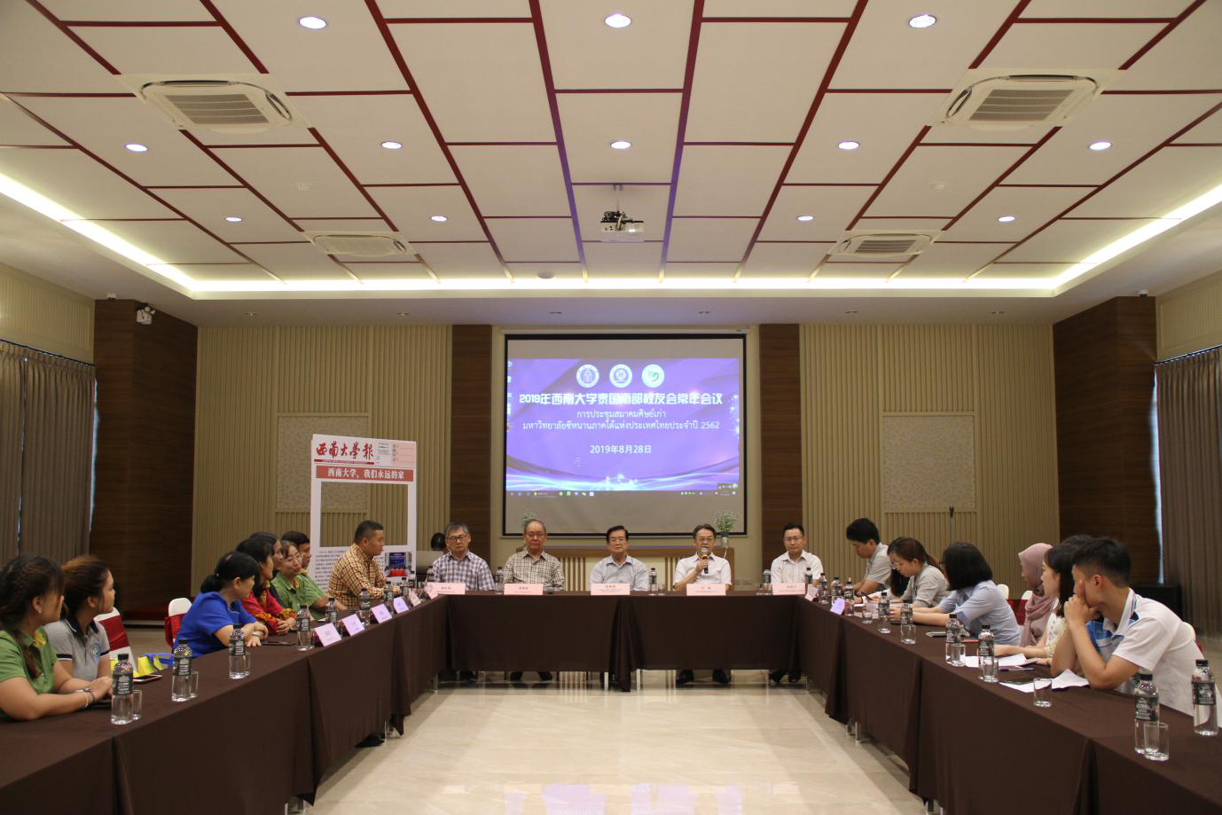 30日下午,继泰北员工会揭牌仪式之后,来自泰东北各府的30余名西大员工代表齐聚孔敬大学孔子公司含弘讲堂,召开首届员工座谈会。中国驻泰王国大使馆一等秘书宋若云 ,刘猛书记,胡琳经理等出席座谈。据初步统计,员工们来自泰国的各行各业,有政府公务员、银行职员、商人等,其中大多数是在泰从事汉语教育工作,是泰国本土汉语教师的中坚力量。