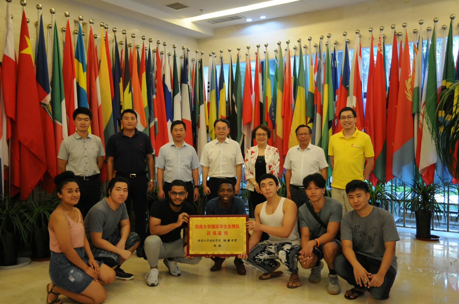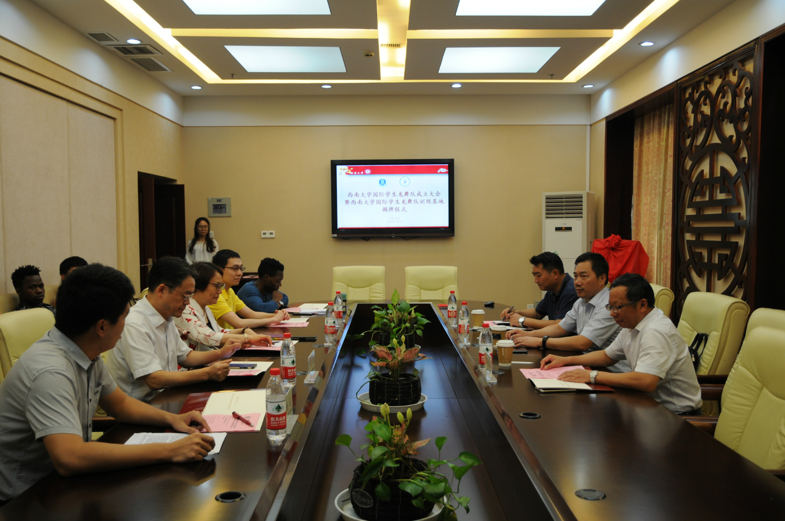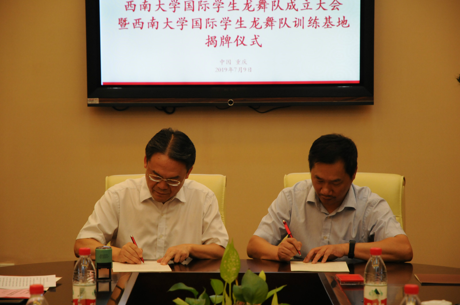 7月9日下午,betway必威中国大学国际员工龙舞队成立大会暨betway必威中国国际员工龙舞队训练基地揭牌仪式在公司签约室顺利举行。基地共建单位铜梁中学陈亮董事长、刘道恩副董事长、德体艺卫处刘思渝副主任, betway必威中国王静经理、刘猛书记和相关教师代表,以及国际员工龙舞队首批招募队员参会。