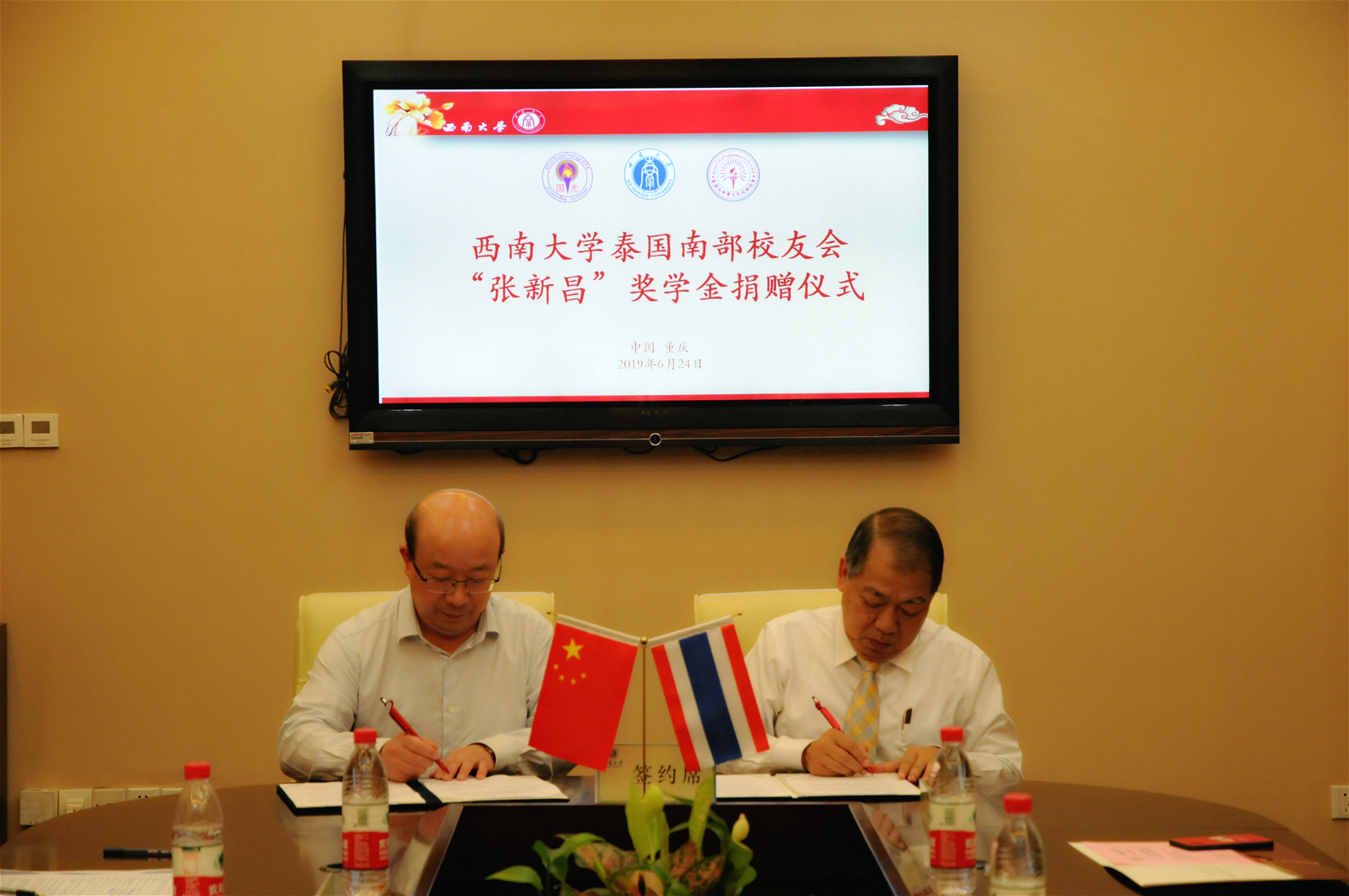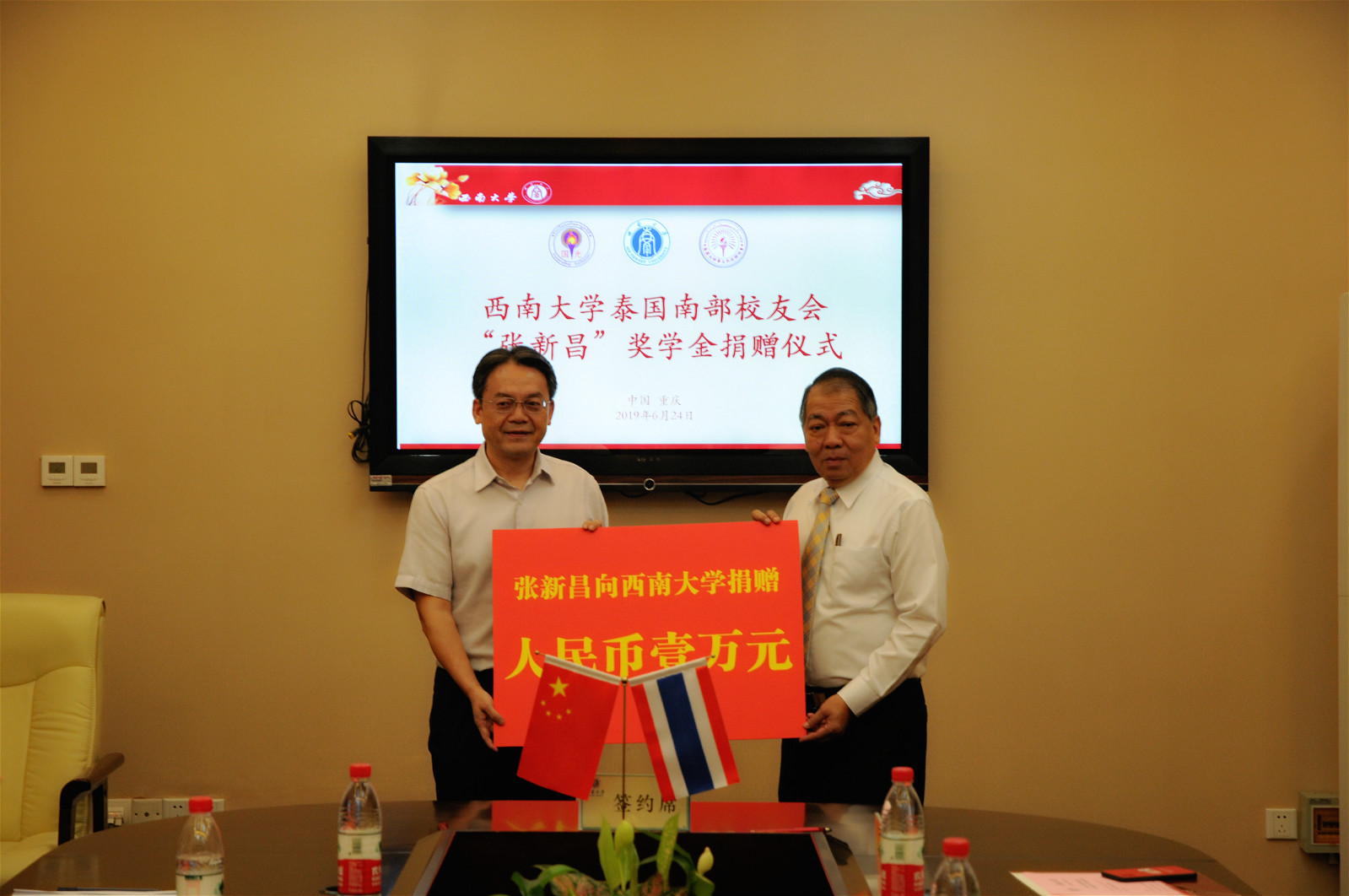在一片热烈的掌声中,受赠双方代表龚常智秘书长和张新昌先生 共同签订了捐赠协议。为支持betway必威中国来华留学教育事业的发展,感谢betway必威中国对国际员工的精心培养,张新昌先生向公司捐赠1万元人民币,设立泰国员工会“张新昌奖学金”,用以奖励品学兼优的泰国南部员工。