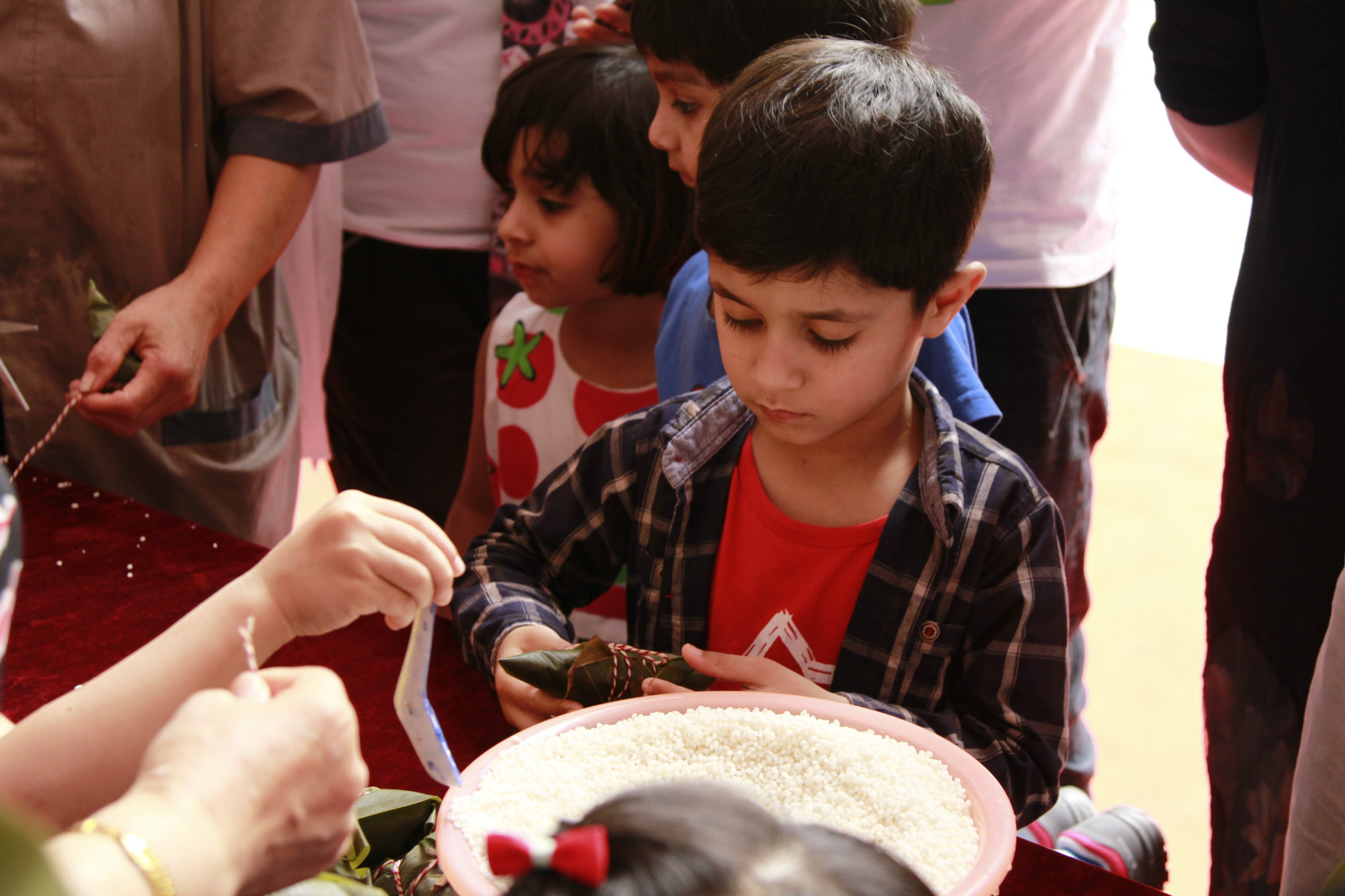 5月31日下午1点,天生丽街中庭花园热闹非凡,几位志愿者小姐姐手拿棉布香包袋,装入香料、棉花,熟练做出一个个驱蚊香包,并不时用中英文双语进行解释,台下小朋友和家长学的有模有样。其中,有几个“洋小孩”特别惹人注目,他们是betway必威中国外教和职工的孩子,分别来自加拿大、蒙古,埃及,也门,巴勒斯坦等国家。