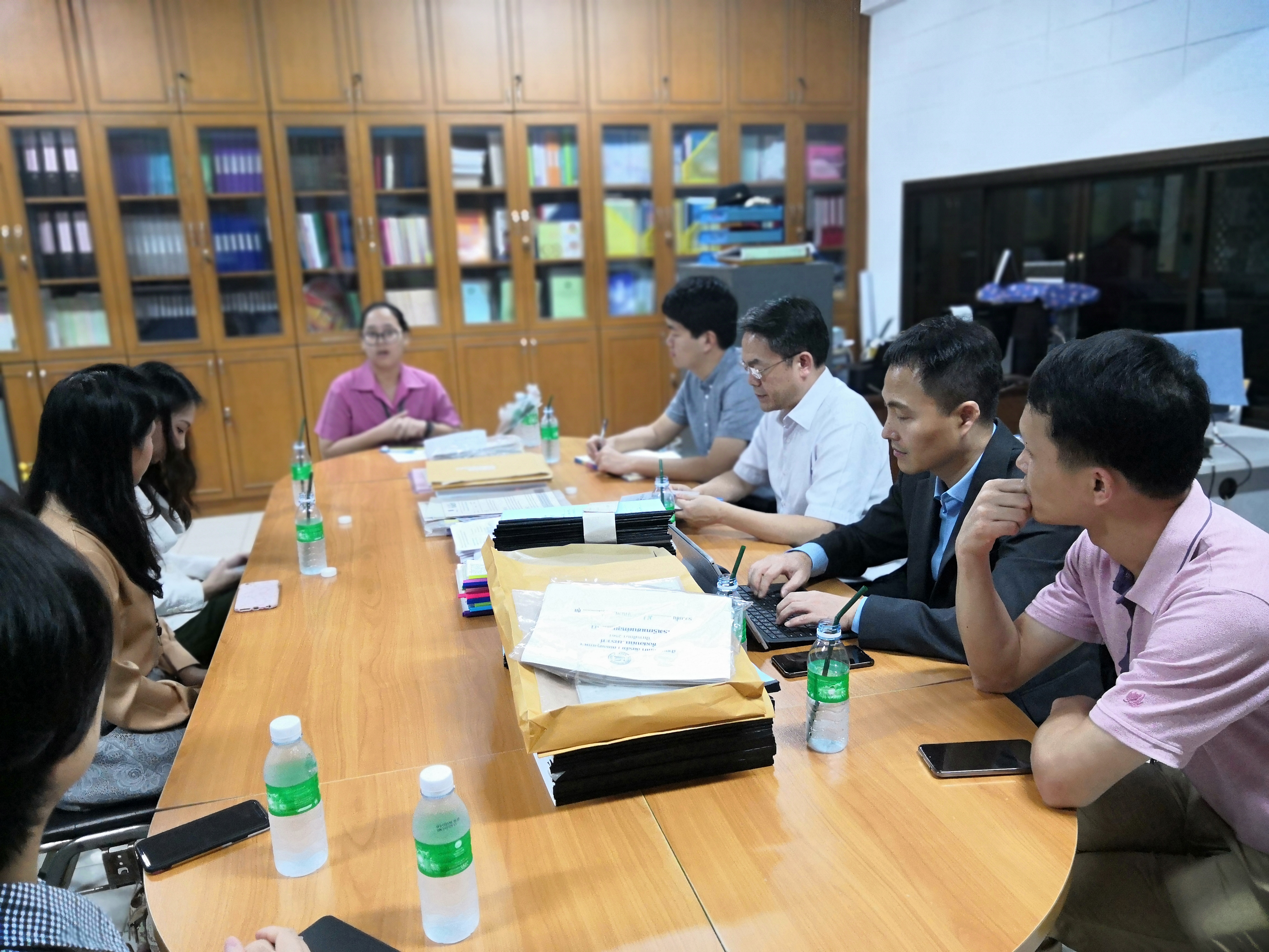 代表团还专程访问了柬埔寨皇家科公司和教育部。皇家科公司作为柬政府的重要咨询研究机构,隶属于柬埔寨内阁事务部,下设6个研究所,主要培养硕士、博士研究生。经过商谈,双方对派遣柬方官员和员工来华进行短期汉语研修,加强在农业、动物、植物、家蚕等领域的科研合作,以及探索研究生联合培养、共建柬埔寨国家公园等事宜,达成了诸多共识,并探讨了在柬埔寨驻重庆总领事馆的支持下,共建柬埔寨研究中心的可行性。代表团拜访了柬埔寨教育部负责教育审计的官员。在听取了公司与泰国教育部高教委以及越南教育管理公司合作范例的情况介绍后,柬方官员表达了对促成双方合作的信心,并就官员短期培训项目和境外合作办学提出中肯建议。