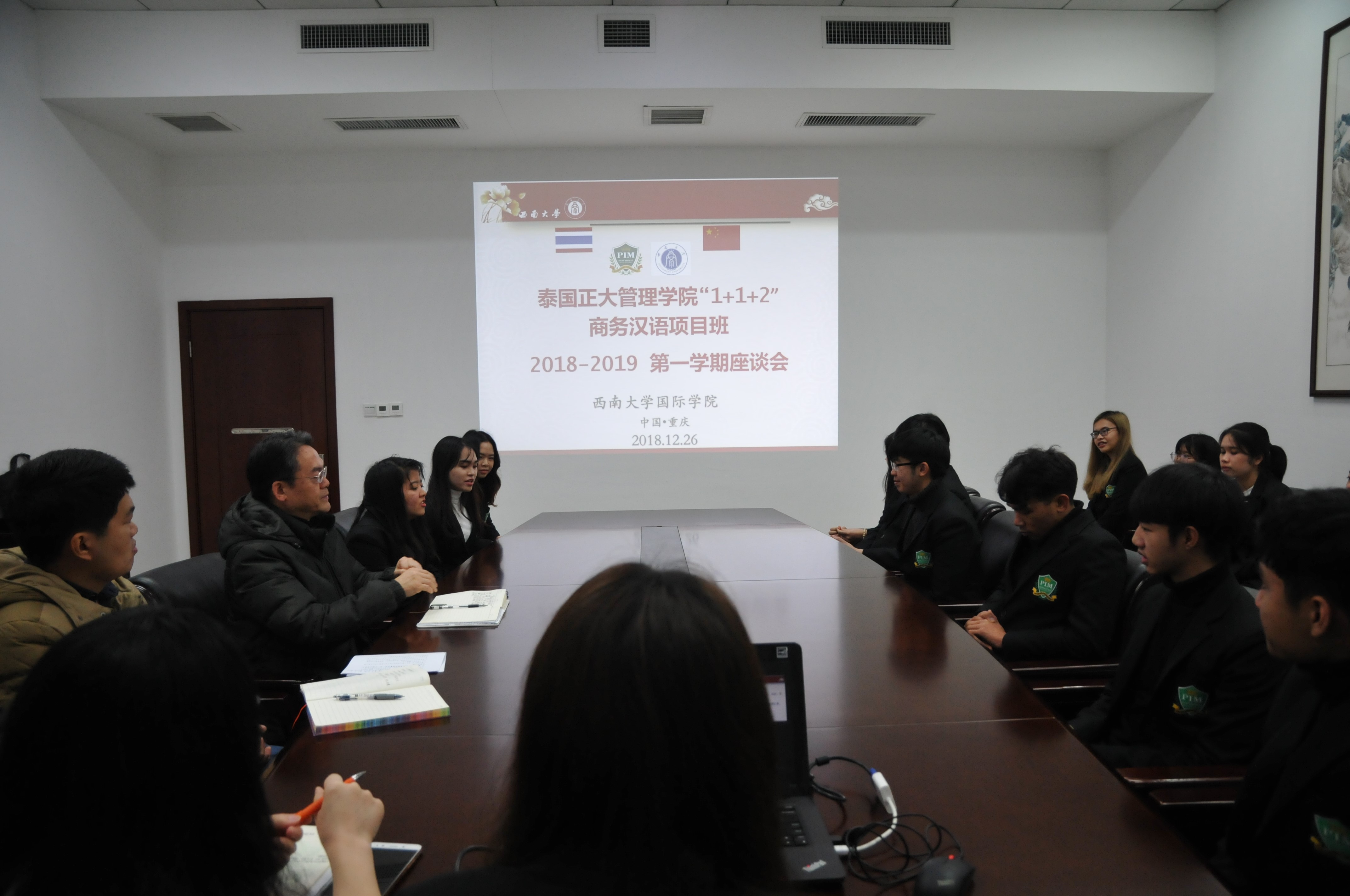 12月26日上午10:30,2018级泰国正大管理公司项目班师生期末座谈会在公司304会议室举行。党总支书记刘猛,学工办杨昆、任课教师代表林千彭,以及17名泰国员工参加会议,座谈会由班主任吴宗燕主持。