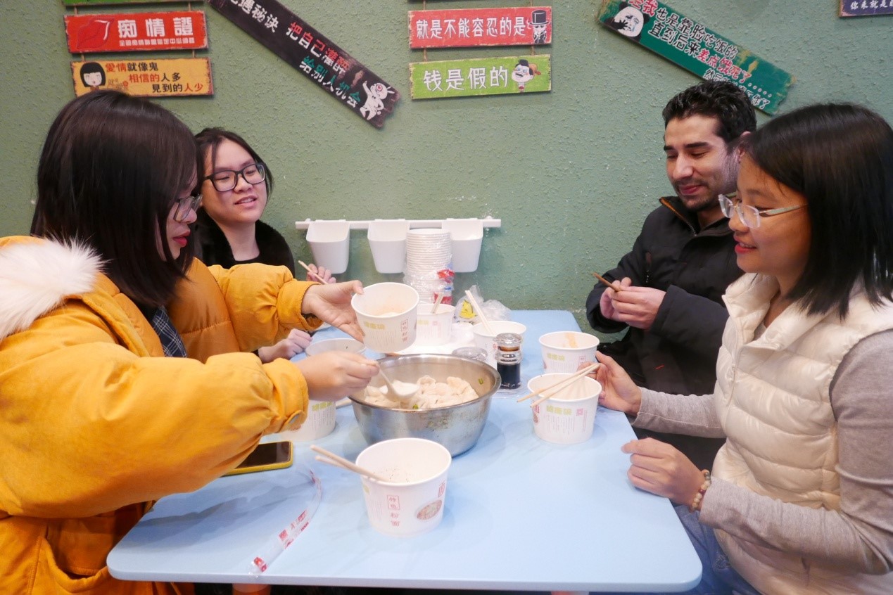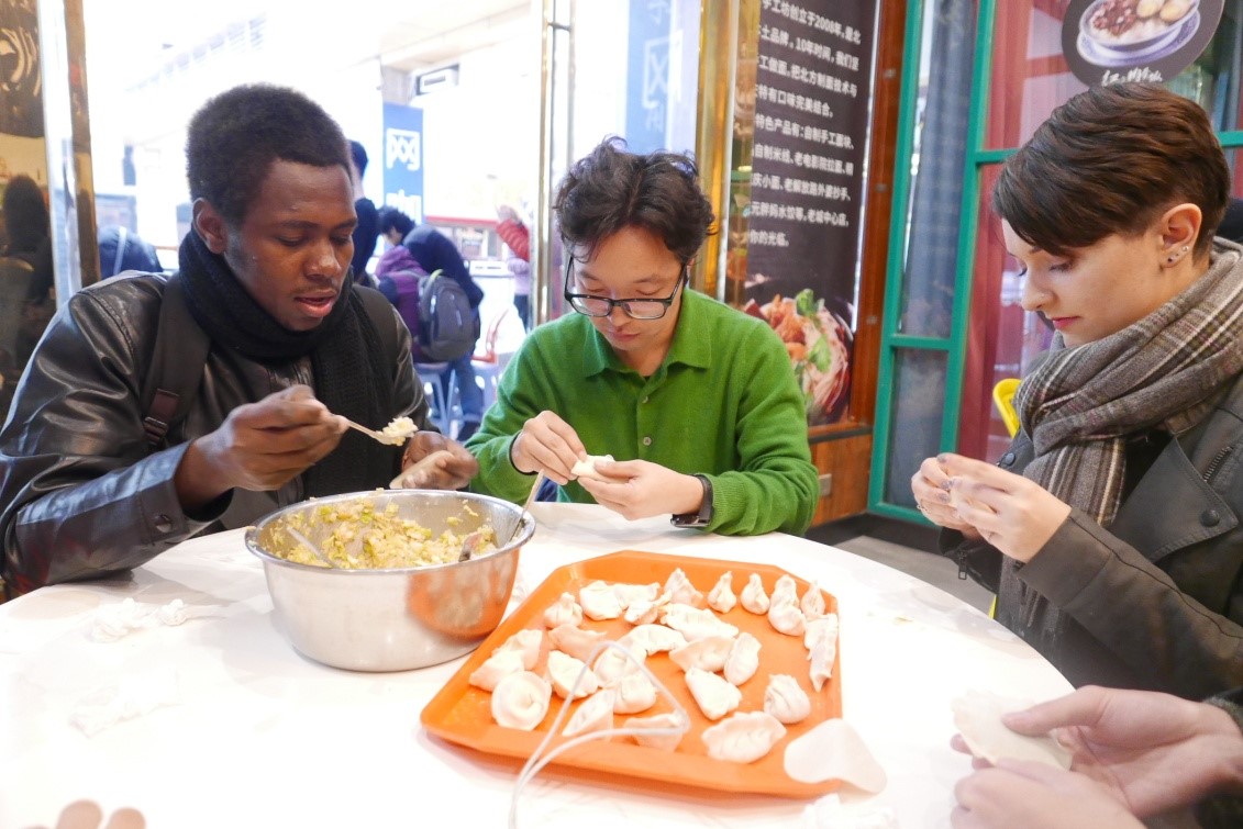 根据同学们的饮食习惯和宗教信仰,活动准备了猪肉、鸡肉、鸡蛋、白菜、香菇、莲藕等丰富的食材。随后,在老师的指导下同学们开始动手包饺子。大家不仅学会了包中国传统饺子,还发挥想象力包出了“宝石饺子”“玫瑰饺子”“刺猬饺子”等新式饺子。此外,同学们还学会了包抄手,在学习的过程中,他们进一步了解到了中国南北方饮食的差异。随后,同学们一起烹制了自己做的饺子和抄手,并在其乐融融的氛围中品尝了自制中华美食。