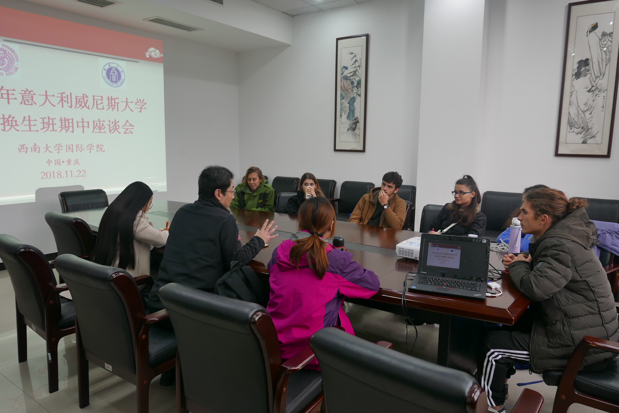11月22日下午,意大利威尼斯大学交换生班期中座谈会在betway必威中国紫云楼304会议室举行。副经理李航,教师代表王菁,以及2018年意大利威尼斯大学交换生班部分员工参加了本次座谈。会议由班主任刘妍芩主持。
