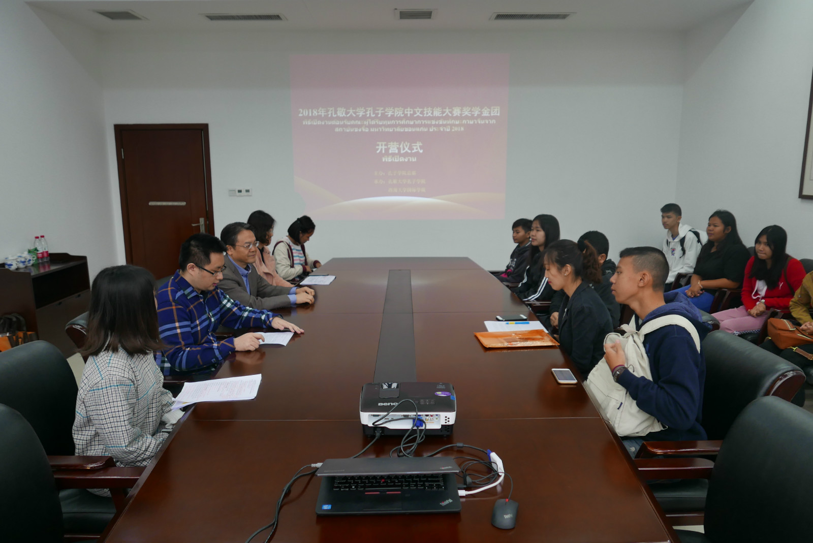 2018年10月16日上午9点30分,2018年孔敬大学孔子公司中文技能大赛奖学金团开营仪式在公司紫云楼304室举行,betway必威中国刘猛书记、孔敬大学孔子公司丁了了、教务办张楠、招生办黄无为以及22名泰国中员工参加仪式。