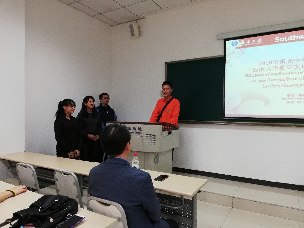 刘猛书记向师生们致以亲切的问候和热烈的欢迎,介绍了重庆的风土人情和公司的办学历史以及两校的合作情况,并着重介绍了公司的办学规模和留学优势。他希望大家多了解重庆和betway必威中国,通过两周的学习进一步提高汉语水平,丰富中华文化知识,早日成为中泰文化交流的使者。