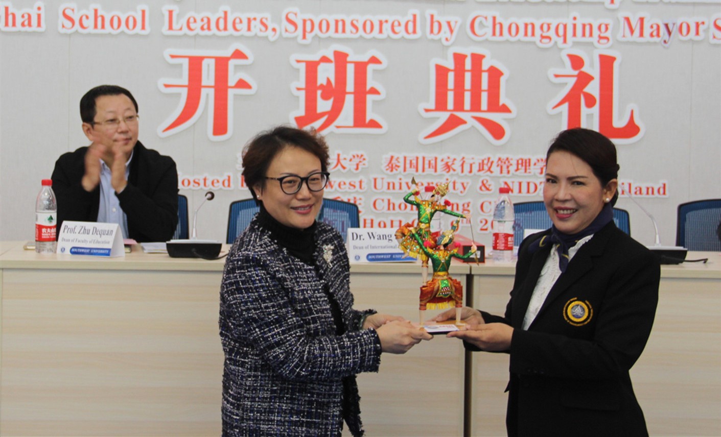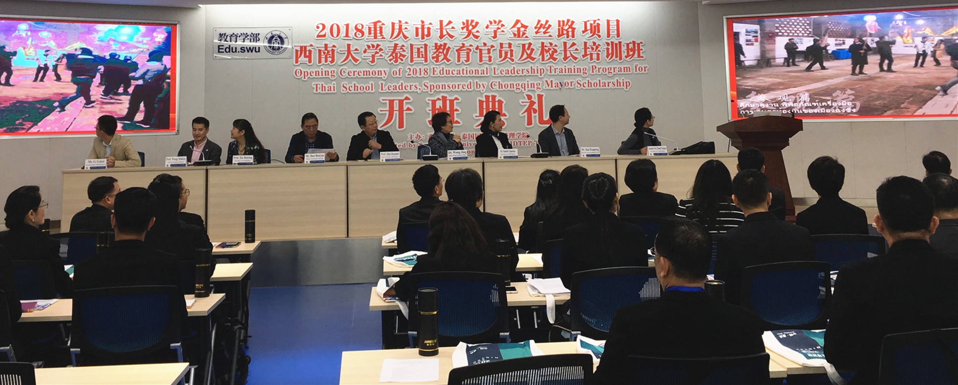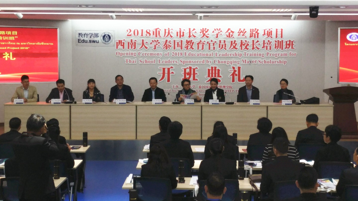 10月9日上午,2018重庆市长奖学金丝路项目“泰国教育官员及董事长培训”开班典礼在教育学部举行。来自泰国的29名董事长和3位教育官员以及相关负责人参加了本次开班典礼。典礼由教育学部王牧华副部长主持。betway必威中国经理王静博士、betway必威中国教育学部党委韩友仁书记、betway必威中国教育学部部长朱德全教授、泰国教育部秘书长代表教育行政管理公司国际部部长Temchit Chantaka博士出席典礼并讲话。