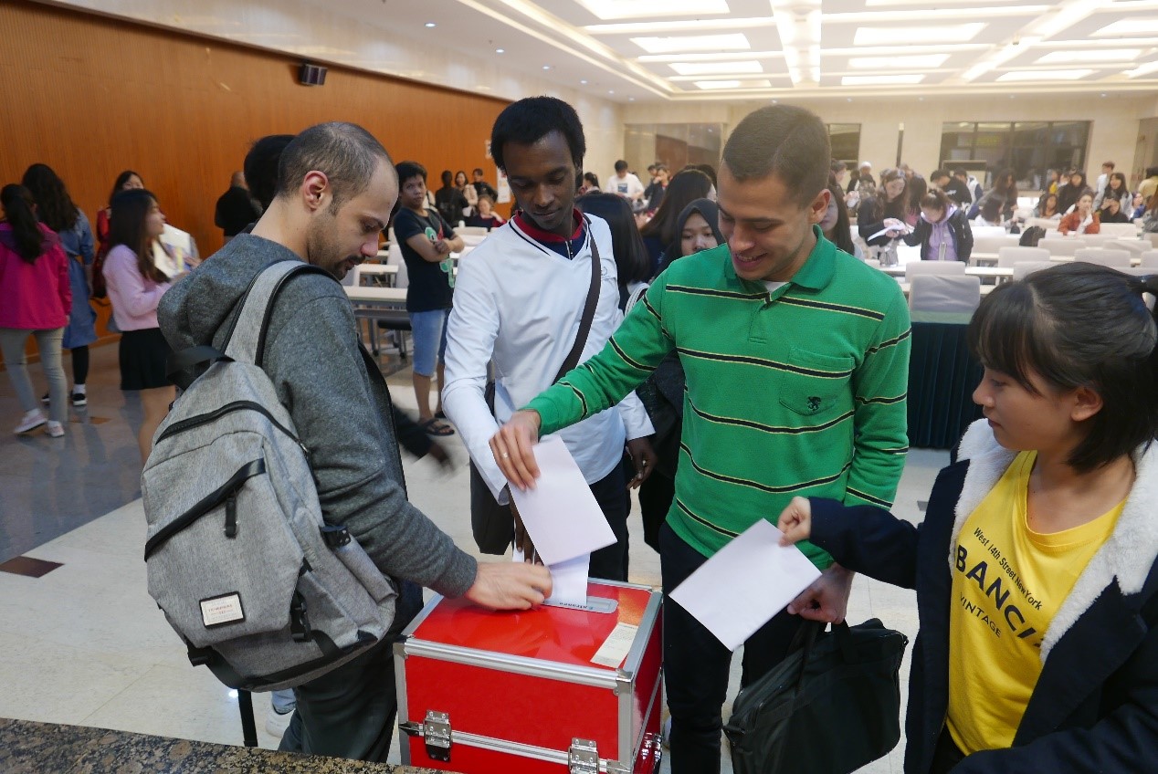 在主持人介绍了选举规则和投票方法之后,竞选演讲正式开始。来自17个国家的30位竞选人依次上台发表演说,分别就自己对员工会的认识,以及在过去工作中取得的优异成绩,对未来工作的展望等方面做出了激情的演讲,并博得了台下同学的热烈喝彩。所有演讲结束之后,在现场工作人员的组织下,国际员工代表依次投下自己神圣的一票。最后,竞选同学和大会工作人员合影留念,选举大会圆满结束。