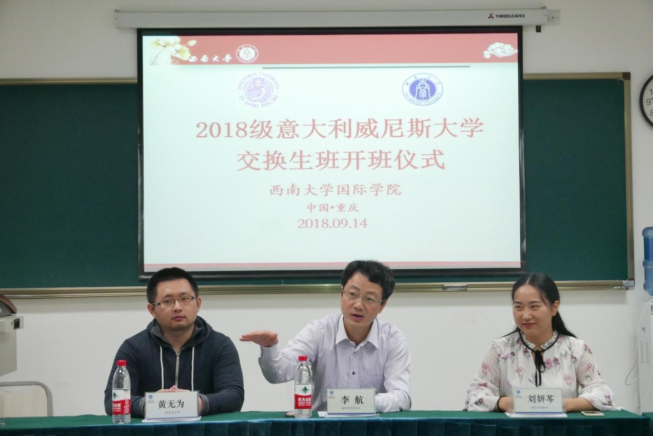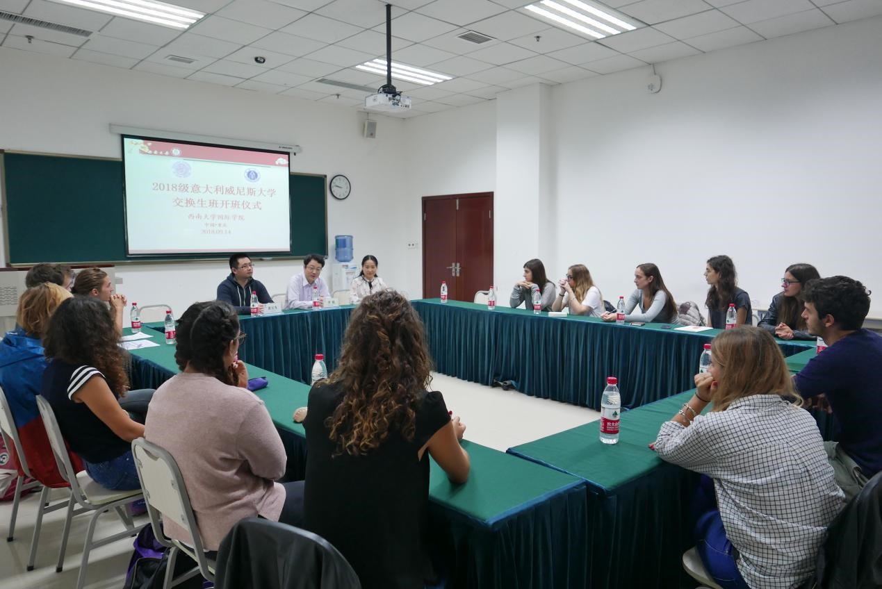 2018年9月14日上午8点50分,2018年意大利威尼斯大学交换生班开班仪式在betway必威中国紫云楼312教室举行。betway必威中国李航副经理,教学秘书杨凌霄老师,招生办公室黄无为老师,2018年意大利威尼斯大学交换生班新生参加了本次会议。会议由班主任刘妍芩主持。