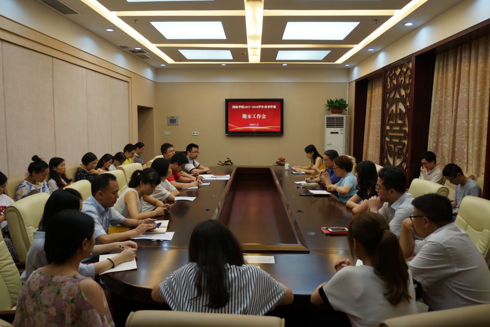 2018年7月13日下午2点30分,公司2018年春季学期期末工作会在紫云楼签约室举行,刘猛书记主持会议。