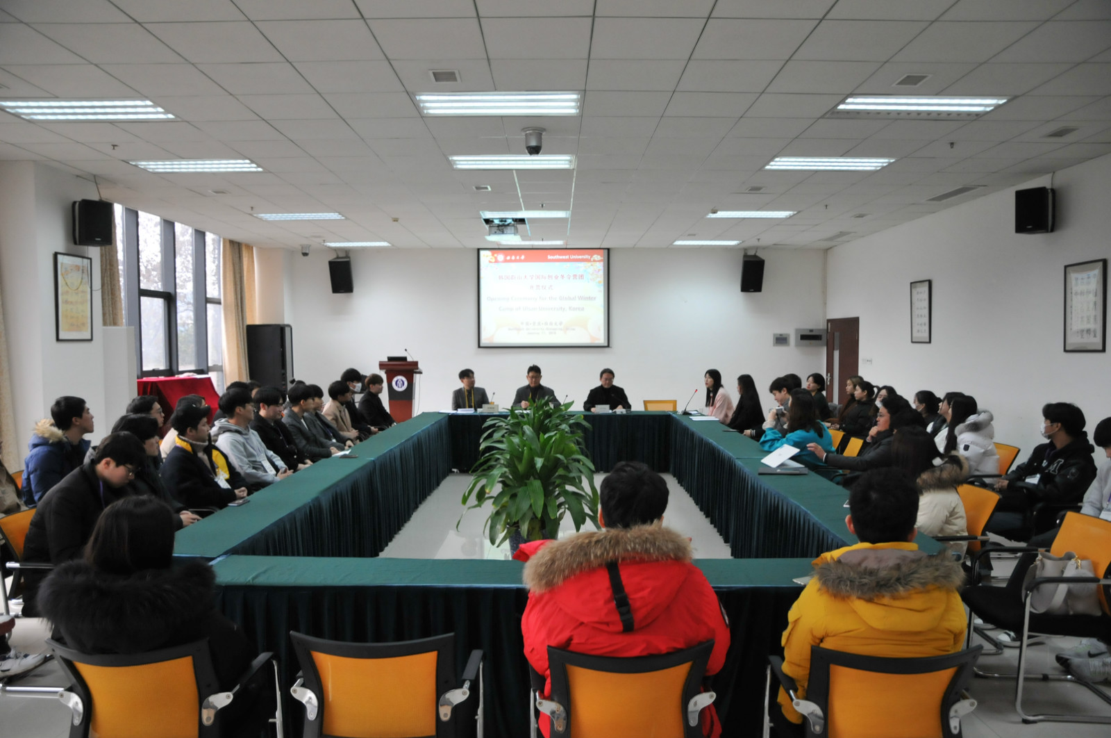 1月11日上午,韩国蔚山大学国际创业冬令营开营仪式在公司举行。国际公司党总支书记刘猛,蔚山大学创业支援团副团长具滋缘,以及38名韩国老员工创业团队成员参加了开营仪式。