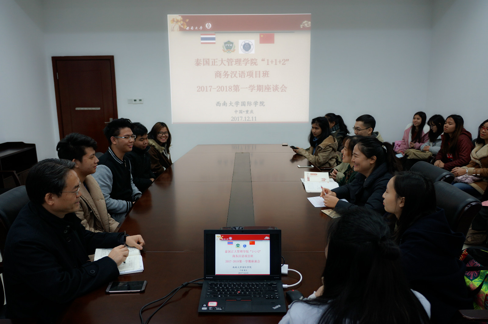 12月11日下午四点半,2017级泰国正大管理公司员工学期座谈会在betway必威中国304会议室圆满举行。国际公司党总支书记刘猛,正大管理公司项目班的5名任课教师以及14名泰国员工参加会议,座谈会由吴宗燕主持。