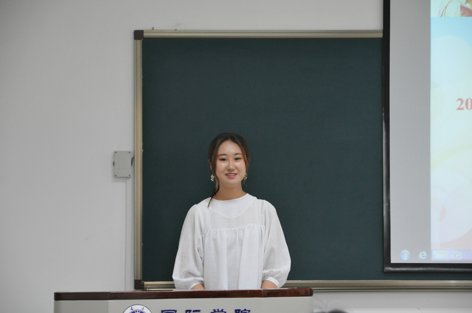 来自文公司对外汉语系的志愿者代表吉星怡同学随后表达了她对韩国朋友们的希冀。简练而真诚的话语中承载着满满的诚挚的祝福。本次夏令营的志愿者分别来自文公司和公司韩语协会,他们将在接下来的一个月的时间里对蔚山大学的员工们进行一对一的汉语辅导,并随时提供生活上的帮助。