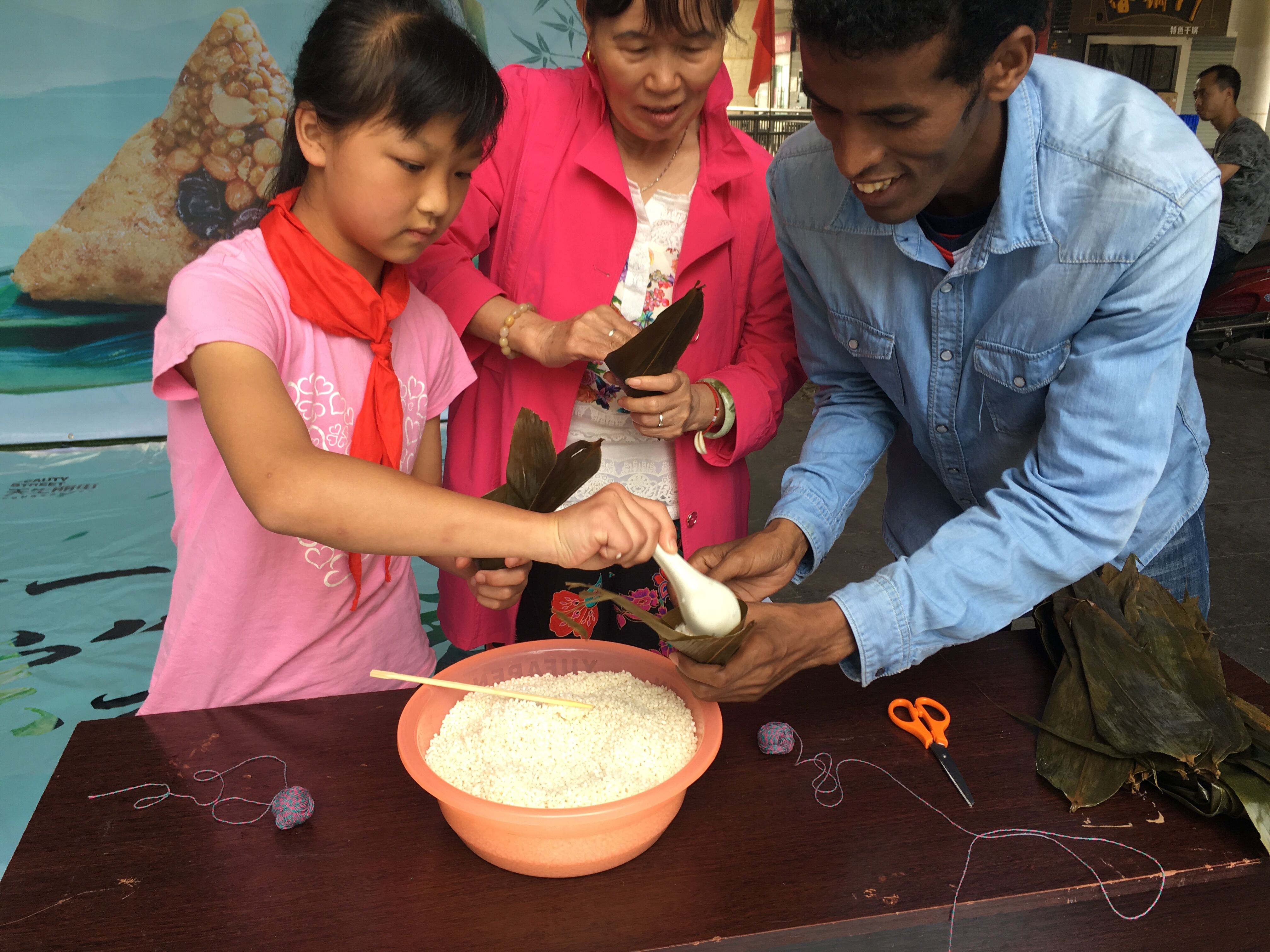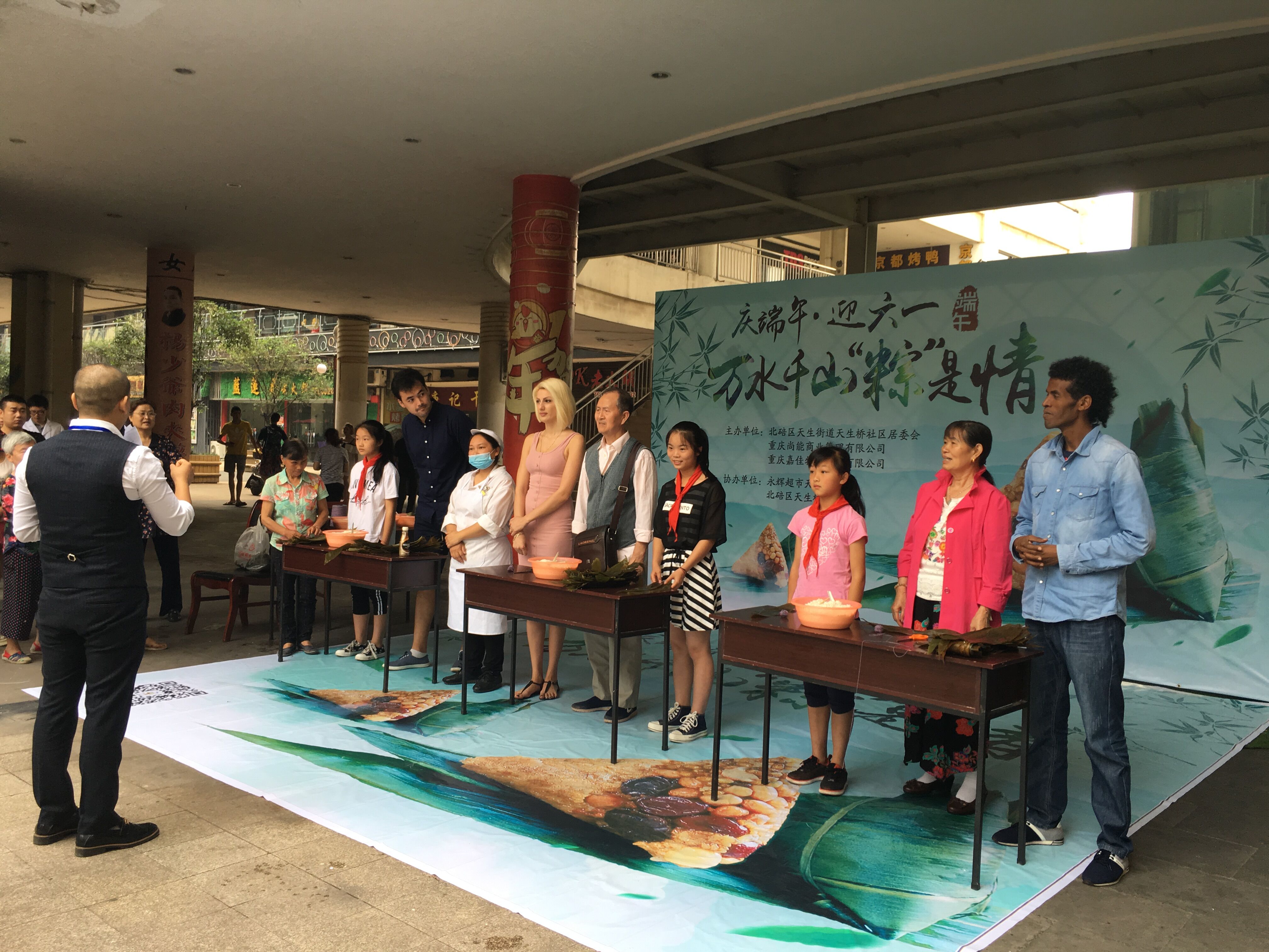 上午9点半,北碚天生街道天生桥社区天生丽街永辉超市门口前人头攒动,职工们和来自天生桥社区的老人、小孩儿一起比赛包粽子。亚美尼亚的安妮、坦桑尼亚的Mohamed、赞比亚的Gift获得了一等奖的好成绩,其他同学也分别获得了二、三等奖。包粽子比赛结束以后,还进行了有奖回答环节,职工们踊跃答题。最后,职工们和居民、小朋友一起品尝粽子,祝福全区人民端午节快乐并合影留恋。