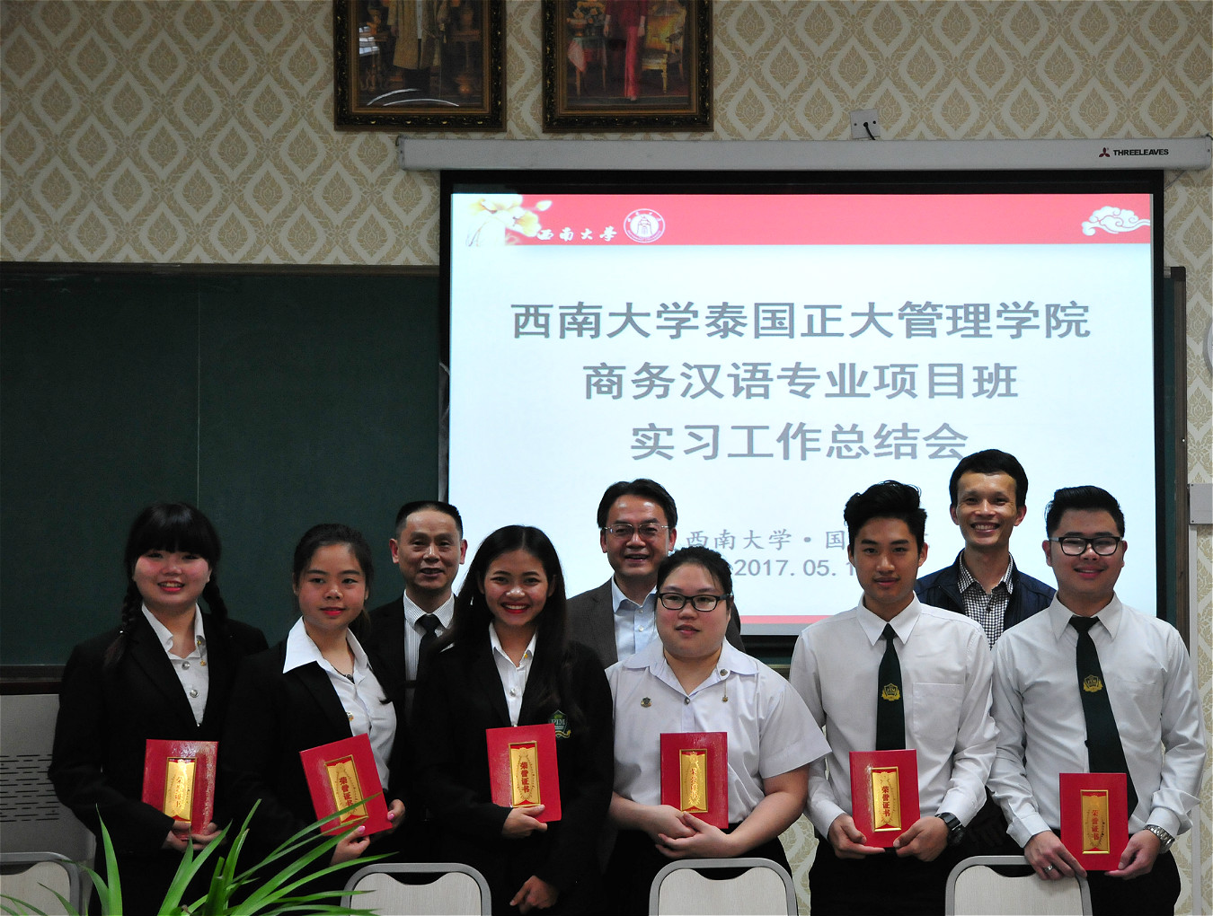 泰国同学们的实习表现得到了实习单位领导、老师的认可,根据实习考核及实习指导教师的反馈,最终评选出6名在实习中表现优秀的同学,他们是唐兰、吴秀丽、林子晴、江汐、丁融、陈金水。到场领导为获奖同学颁奖并合影留念。