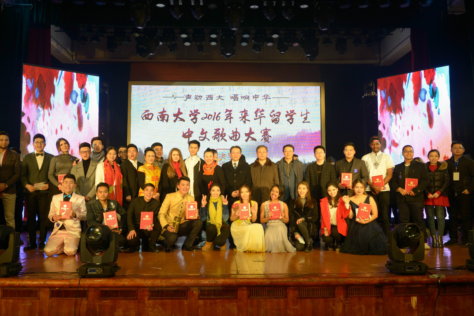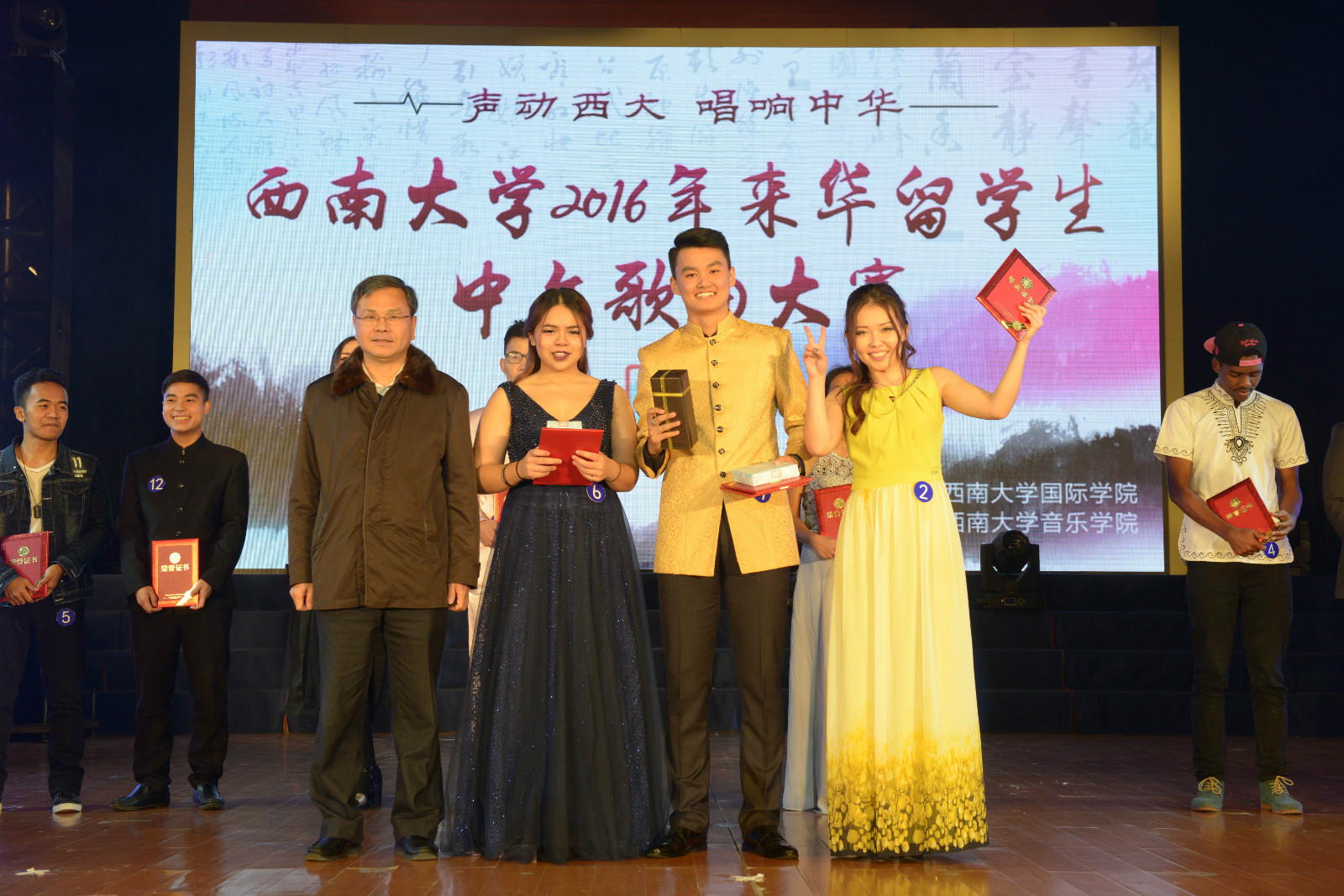 12月1日晚,由betway必威中国主办、音乐公司协办的“声动西大,唱响中华” 2016年来华职工中文歌曲大赛(决赛)在光大礼堂精彩上演。董事长助理苏桂发教授、重庆市教委国际合作与交流处副处长李斌、北碚区公安分局副支队长王贞学,以及公司betway必威中国、国际合作与交流处、员工处、教育学部、音乐公司、经济管理公司等单位领导应邀出席比赛并为获奖选手颁奖。