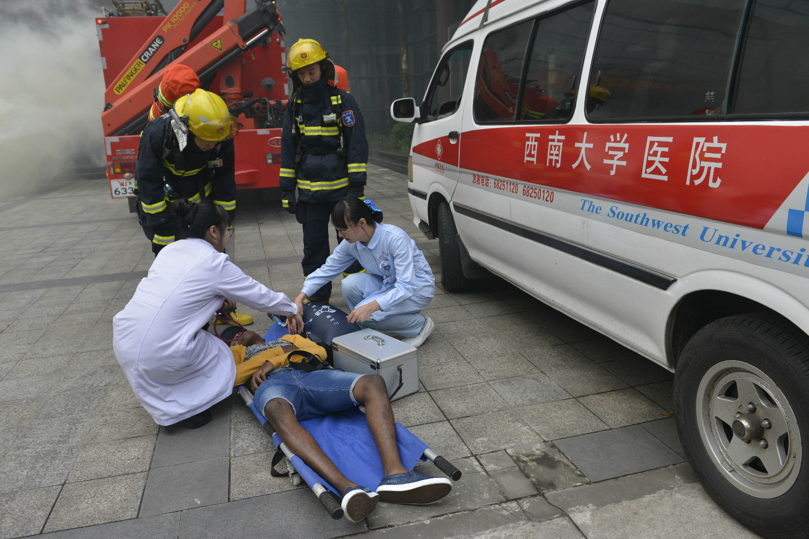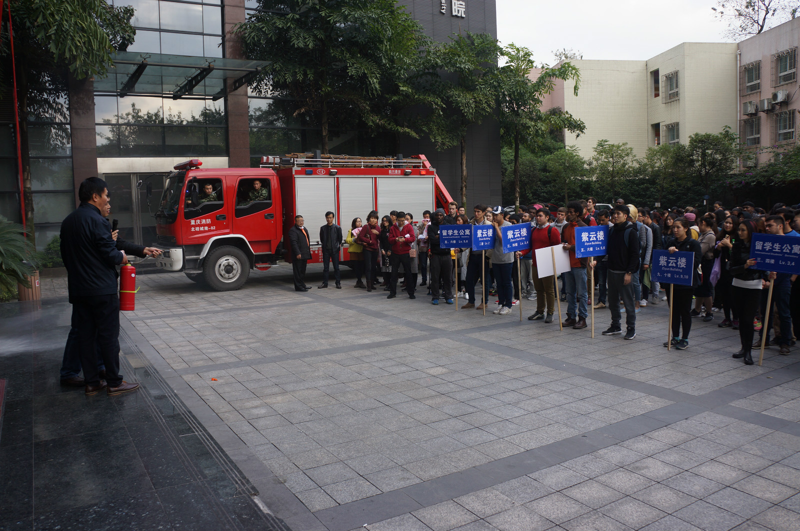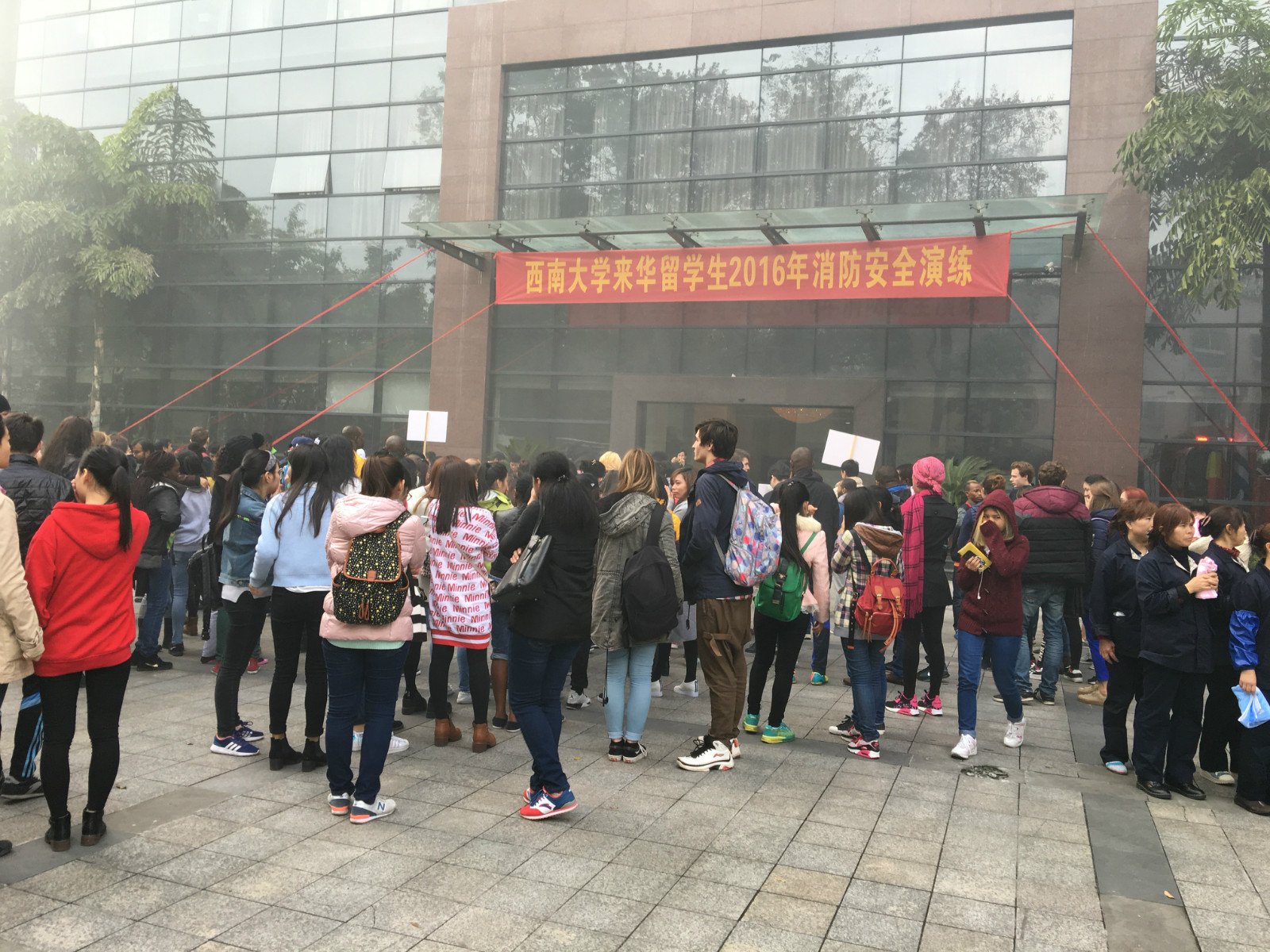 11月11日下午4点,betway必威中国紫云楼门前浓烟滚滚、警报长鸣,只见各国职工们用湿毛巾捂住口鼻,快速有序地从房间和教室逃离。烟雾中,伴随着纷纷逃离的人群,一名冰敷输液的“伤员”被担架从紫云楼中抬出,已然得到了有效“救治”。待浓烟散去,惊魂甫定的围观群众才发现紫云楼前的赫然几个大字:“betway必威中国来华职工2016年消防安全演练”。
